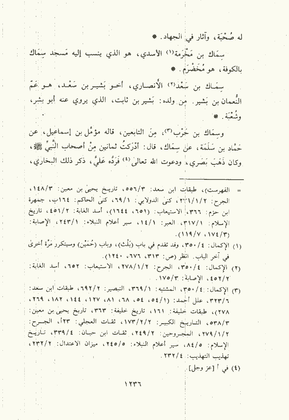 وسِمَاك بن حَرْب , من التابعين , قاله مؤمل بن إِسْمَاعِيل , عن حَمَّاد بن سَلَمة , عن سِمَاك قال: أدركت ثمانين من أصحاب النَّبِيّ صلى الله عليه وسلم , وكان ذهب بَصْريّ ودعوت الله تعالى فرده علي , ذكر ذلك البُخَاريّ قال: قال لي مُحَمد , عن مؤمل فيما أخبرنا علي , عن ابن فارس عنه.