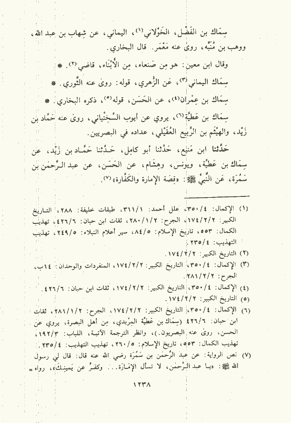 حَدَّثَنا ابن منيع , حَدَّثَنا أبو كامل , حَدَّثَنا حمَّاد بن زيد , عن سماك بن عَطِيَّة ويونس وهشام , عن الحَسَن , عن عَبْد الرَّحْمن بن سمرة , عن النَّبِيِّ صلى الله عليه وسلم: "قصة الإمارة والكفارة".