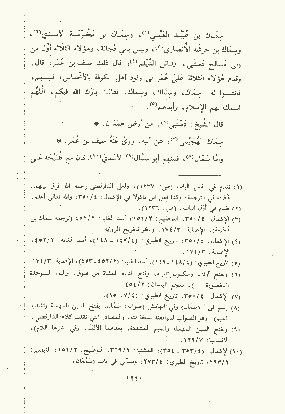 سِمَاك بن عُبَيْد العَبْسِي , وسِمَاك بن مَخْرَمة الأَسَدِيّ , وسماك بن خَرَشَة الأَنْصَاريّ , وليس بأبي دِجَانَة , وهؤلاء الثلاثة أول من ولي مسالح دستبي وقاتل الديلم , قال ذلك سيف بن عُمَر قال: وقدم عؤلاء الثلاثة على عمر في وفود أهل الكوفة , بالأخماس فنسبهم فانتسبوا له: سِمَاك وسِمَاك وسِمَاك، فقال: بارك الله فيكم اللهم اسمك بهم الإِسْلاَم وأيدهم.