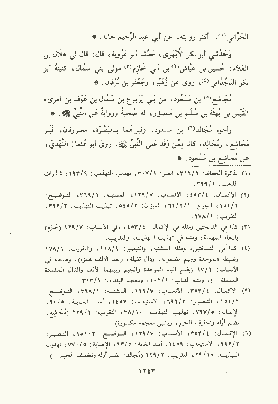 وأخوه مُجَالِد بن مَسْعود وقبراهما بالْبَصْرة معروفان , قبر مُجَاشِع ومجالد , كانا ممن وفد على النَّبِيّ صلى الله عليه وسلم , روى أبو عُثْمان النَّهْديّ , عن مُجَاشِع بن مسعود.