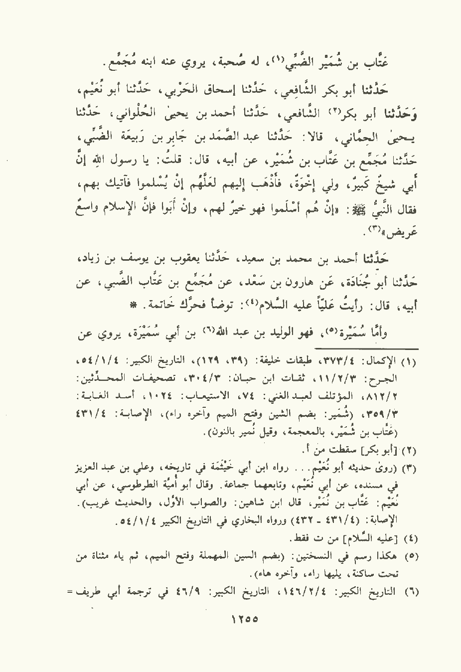 حَدَّثَنا أبو بَكْر الشَّافِعي , حَدَّثَنا إِسْحَاق الحربي , حَدَّثَنا أبو نُعَيْم , وحَدَّثَنا أبو بَكْر الشَّافِعي , حَدَّثَنا أحمد بن يَحْيى الحُلْوَانيّ , حَدَّثَنا يَحْيى الحماني , قَالا: حَدَّثَنا عبد الصَّمَد بن جابر بن ربيعة الضَّبِّي , حَدَّثَنا مجمع بن عَتَّاب بن شُمَيْر , عن أبيه قال: قلت: يا رسول الله إن أبي شَيْخ كبير ولي إخوة فأذهب إليهم لعلهم إن يسلموا فآتيك بهم , فقال النَّبِيّ صلى الله عليه وسلم: "إن هم أسلموا , فهو خير لهم وإن أبوا فإن الإِسْلاَم واسع عريض".