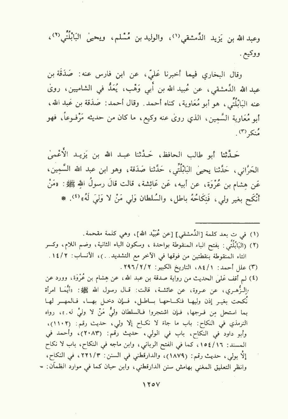 حَدَّثَنا أبو طالب الحافظ , حَدَّثَنا عَبد الله بن يزيد الأعمى الحَرَّانِيّ , حَدَّثَنا يَحْيى البابلُتي , حَدَّثَنا صدقة , وهو ابن عَبد الله السمين , عن هِشَام بن عُرْوَة , عن أبيه , عن عائشة قالت قال رسول الله صلى الله عليه وسلم: "من أنكح بغير ولي فنكاحه باطل , والسلطان ولي من لا ولي له".