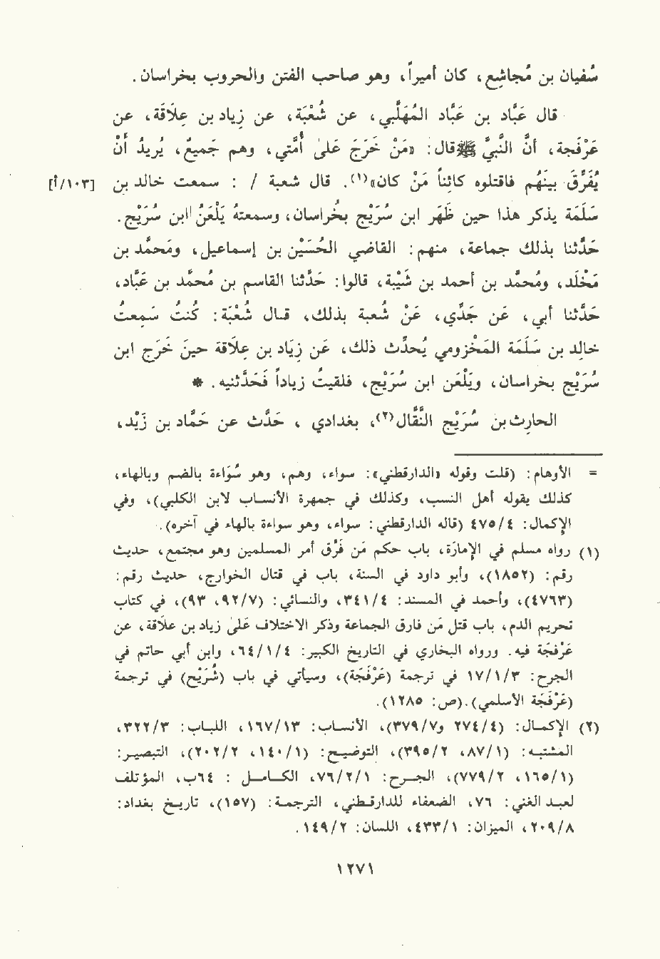 قال عباد بن عباد المهلبي , عن شُعْبة , عن زياد بن علاقة , عن عرفجة أنّ النَّبِيّ صلى الله عليه وسلم قال: "من خرج على أمتي وهم جميع يريد أن يفرق بينهم فاقتلوه , كائنا من كان". قال شُعْبة: سمعت خَالِد بن سلمة يذكر هذا حين ظهر ابن سُرَيْح بخراسان وسمعته يلعن ابن سُرَيْح. حَدَّثَنا بذلك جماعة منهم: القاضي الحُسَين بن إِسْمَاعِيل , ومُحمَّد بن مخلد , ومُحمَّد بن أحمد بن شيبة , قالوا: حَدَّثَنا القَاسِم بن مُحَمد بن عباد , حَدَّثَنا أبي , عن جدي , عن شُعْبة بذلك قال شُعْبة: كنت سمعت خَالِد بن سلمة المخزومي يحدث ذلك عن زياد بن علاقة , حين خرج ابن سُرَيْح بخراسان , ويلعن ابن سريج , فلقيت زيادا فحدثنيه.