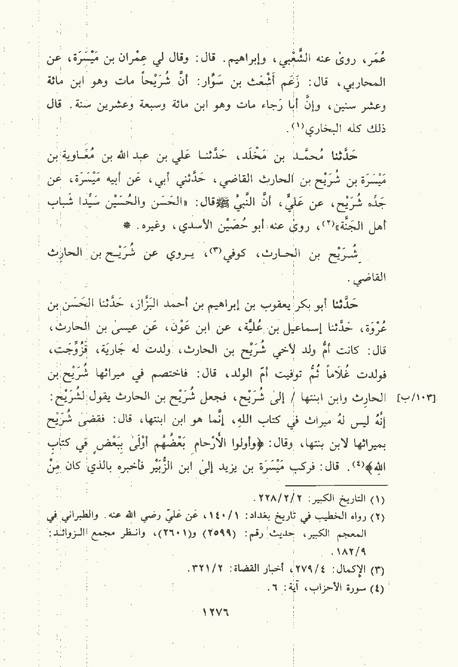 حَدَّثَنا أبو بَكْر يعقوب بن إبراهيم بن أحمد البزاز , حَدَّثَنا الحَسَن بن عُرْوَة , حَدَّثَنا إِسْمَاعِيل بن علية , عن ابن عون , عن عيسى بن الحارث قال: كانت أم ولد لأخي شُرَيْح بن الحارث ولدت له جارية فزوجت فولدت غلاما , ثم تُوفيّت أم الولد، قال: فاختصم في ميراثها شُرَيْح بن الحارث , وابن ابنتها إلى شُرَيْح، فجعل شُرَيْح بن الحارث يقول لشريح: إنه ليس له ميراث في كتاب الله إنما هو ابن ابنتها قال: فقضى شُرَيْح بميراثها لابن بنتها وقال {وَأُولُو الأَرْحَامِ بَعْضُهُمْ أَوْلَى بِبَعْضٍ فِي كِتَابِ اللَّهِ}. قال: فركب ميسرة بن يزيد إلى ابن الزُّبَيْر فأخبره , بالذي كان من شُرَيْح