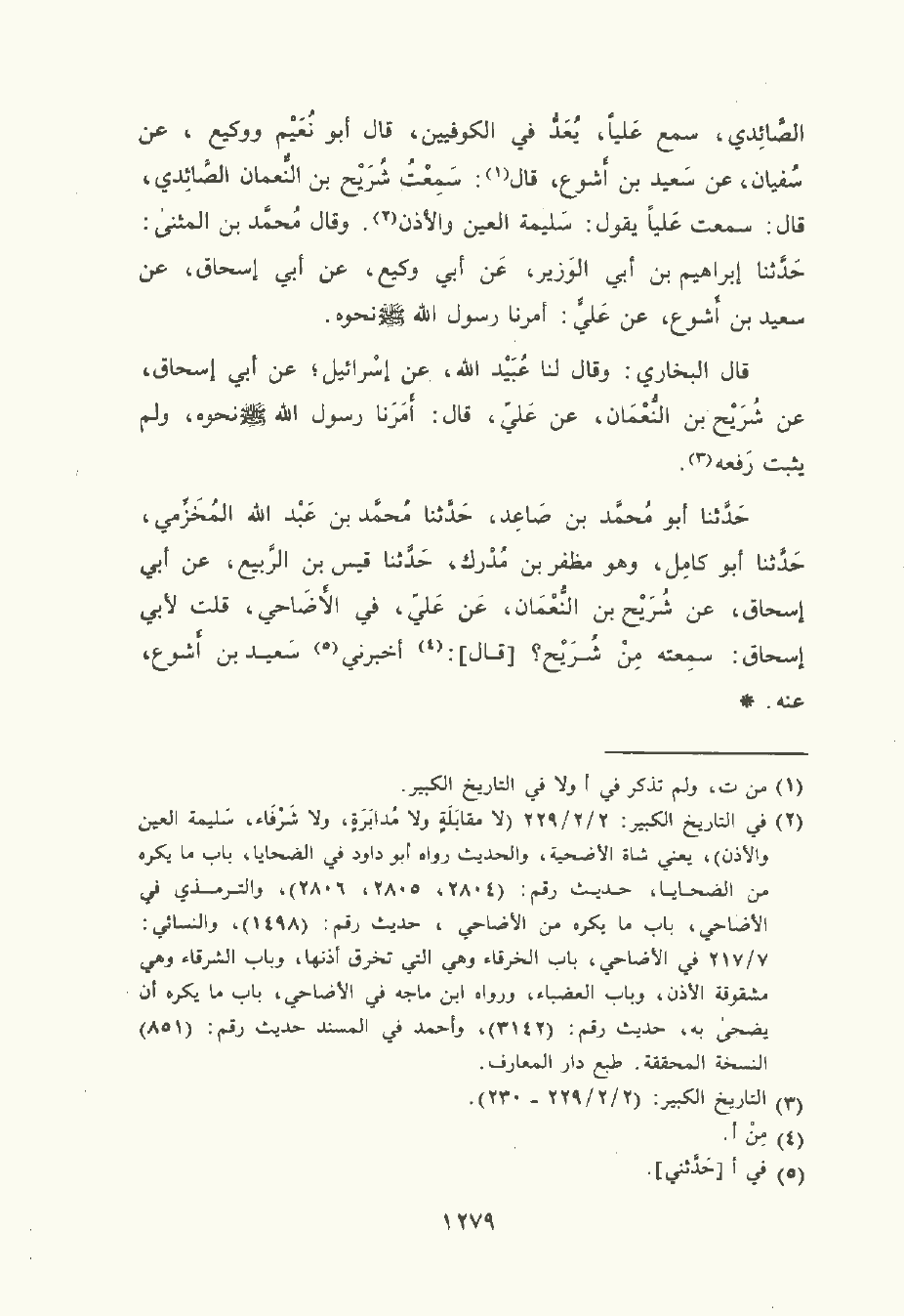 حَدَّثَنا أبو مُحَمد بن صَاعِد , حَدَّثَنا مُحَمد بن عَبد الله المخرمي , حَدَّثَنا أبو كامل , وهو مظفر بن مُدْرك , حَدَّثَنا قَيْس بن الربيع , عن أبي إِسْحَاق , عن شُرَيْح بن النُّعْمان , عن علي في الأضاحي قلت لأبي إِسْحَاق: سمعته من شُرَيْح؟ قال: أخبرني سَعِيد بن أشوع عنه.
