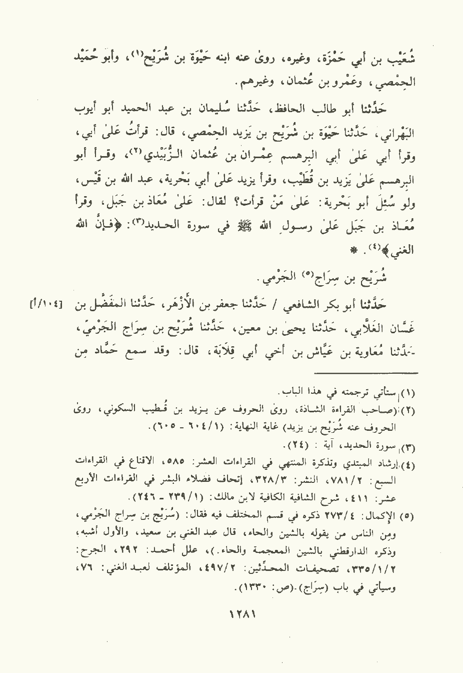 حَدَّثَنا أبو طالب الحافظ , حَدَّثَنا سُلَيْمان بن عَبد الحَمِيد أبو أَيُّوب البهراني , حَدَّثَنا حَيْوَة بن شُرَيْح بن يزيد الحِمْصِي قال: قرأت على أبي وقرأ أبي علي البرهسم عِمْرَان بن عُثْمان الزبيدي , وقرأ أبو البرهسم على يزيد بن قطيب , وقرأ يزيد على أبي بحرية عَبد الله بن قَيْس ولو سُئِل أبو بحرية: على من قرأت؟ لقال: على مُعَاذ بن جبل , وقرأ مُعَاذ بن جبل على رسول الله صلى الله عليه وسلم في سورة الحديد: (فَإِنَّ الله الغَنِيُّ).