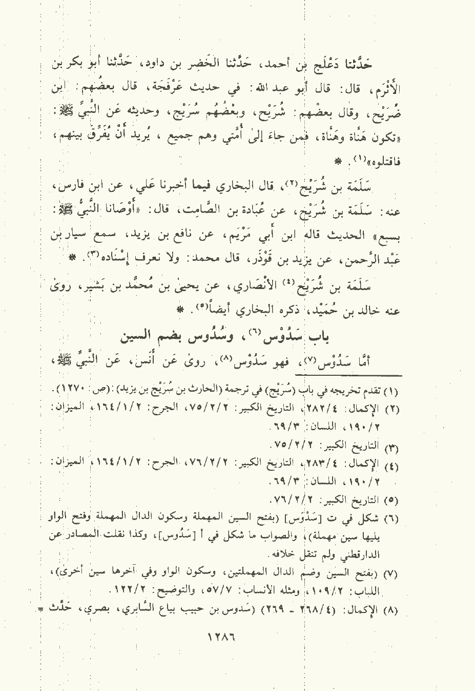 حَدَّثَنا دَعْلَج بن أحمد , حَدَّثَنا الخضر بن داود , حَدَّثَنا أبو بَكْر بن الأَثْرَم قال: قال أبو عَبد الله في حديث عرفجة قال بعضهم: ابن ضريح , وقال بعضهم: شُرَيْح وبعضهم سريح وحديثه , عن النَّبِيِّ صلى الله عليه وسلم: "تكون هناة وهناة فمن جاء إلى أمتي وهم جميع يريد أن يفرق بينهم فاقتلوه".