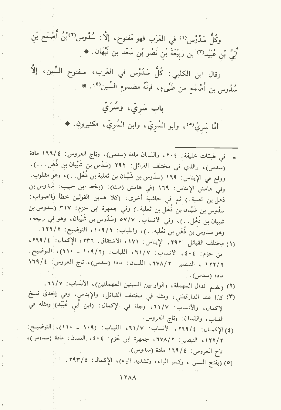 وكل سَدُوس في العرب , فهو مفتوح إلا سُدُوس بن أصمع بن أبي بن عبيد بن ربيعة بن نصر بن سَعْد بن نبهان.
