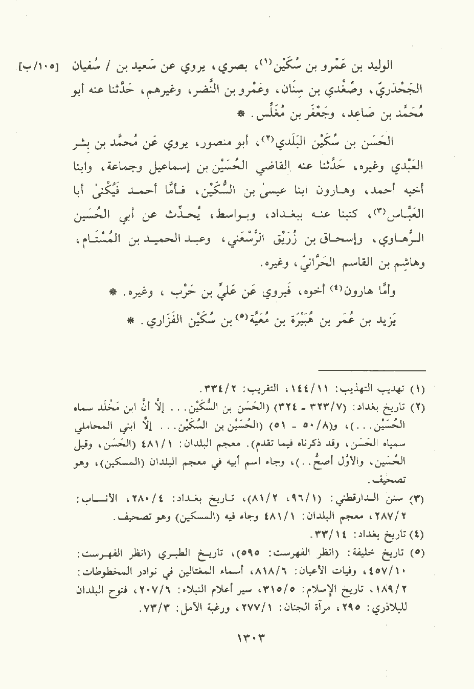 الحَسَن بن سُكَيْن البلدي أبو مَنْصُور , يَرْوي عن مُحمَّد بن بشر العبدي , وغيره , حَدَّثَنا عنه القاضي الحُسَين بن إِسْمَاعِيل وجماعة وابنا أخيه أحمد وهارون ابنا عيسى بن السكين فأما أحمد فيكنى أبا العَبَّاس كتبنا عنه ببغداد وبواسط , يُحَدِّث عن أبي الحُسَين الرهاوي , وإسحاق بن زريق الرسعني , وعَبد الحَمِيد بن المستام , وهاشم بن القَاسِم الحَرَّانِيّ , وغيره.