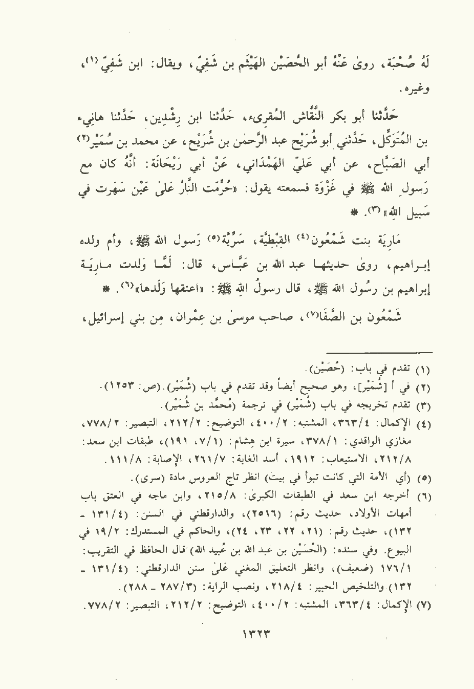 حَدَّثَنا أبو بَكْر النَّقَّاش المُقرىء , حَدَّثَنا ابن رشدين , حَدَّثَنا هانىء بن المُتَوكِّل , حَدَّثني أبو شُرَيْح عَبْد الرَّحْمن بن شُرَيْح , عن مُحمَّد بن سُمَيْر أبي الصَّبَّاح , عن أبي علي الهَمْدَانيّ , عن أبي ريحانة: أنه كان مع رسول الله صلى الله عليه وسلم في غزوة , فسمعته يقول: "حرمت النار على عين سهرت في سبيل الله".