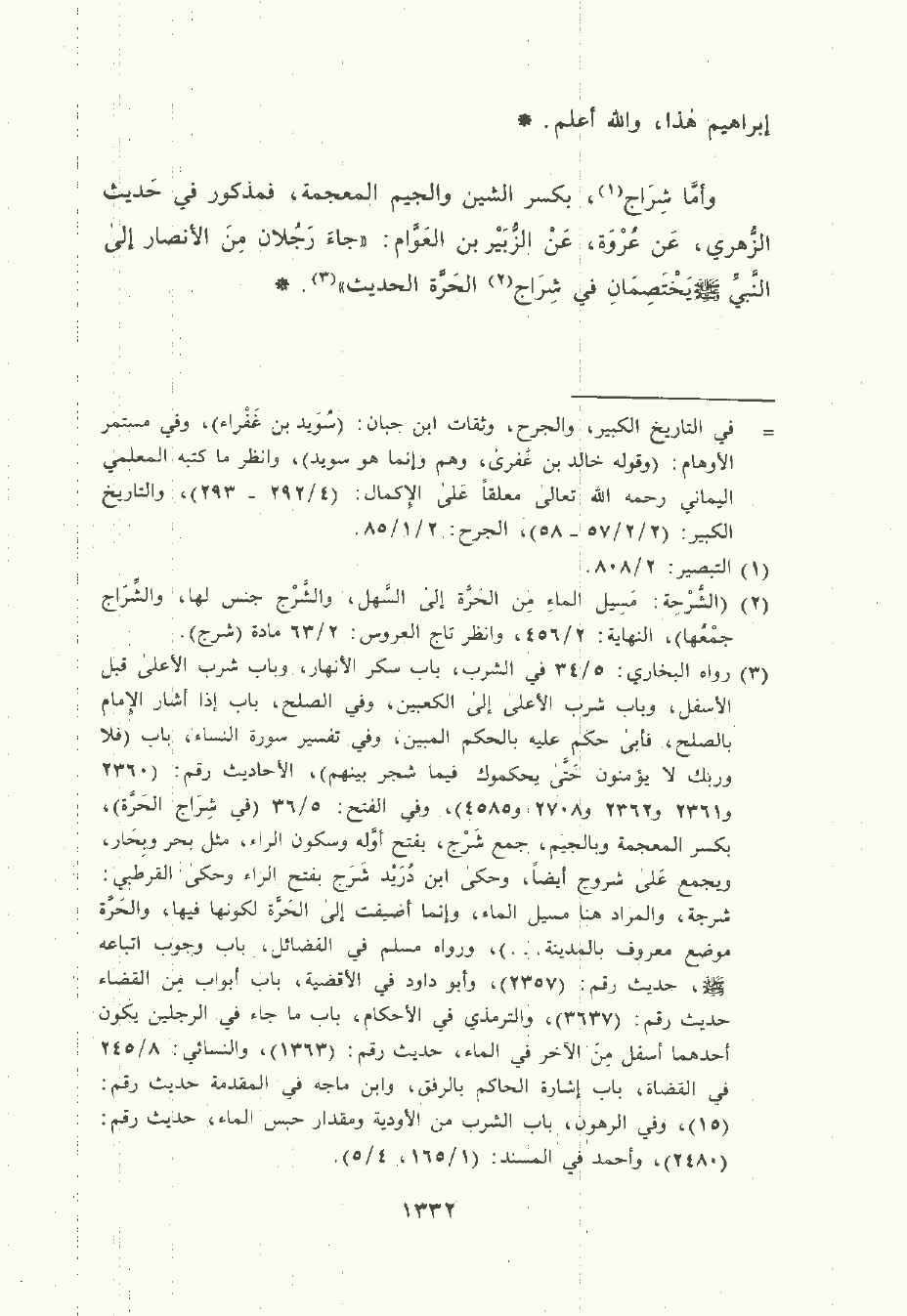 وأمَّا شِرَاج , بكسر الشين والجيم المعجمة , فمذكور في حديث الزُّهْريّ , عن عُرْوَة , عن الزُّبَيْر بن العَوَّام: "جاء رجلان من الأَنْصَار إلى النَّبِيّ صلى الله عليه وسلم يختصمان في شراج الحرة الحديث".