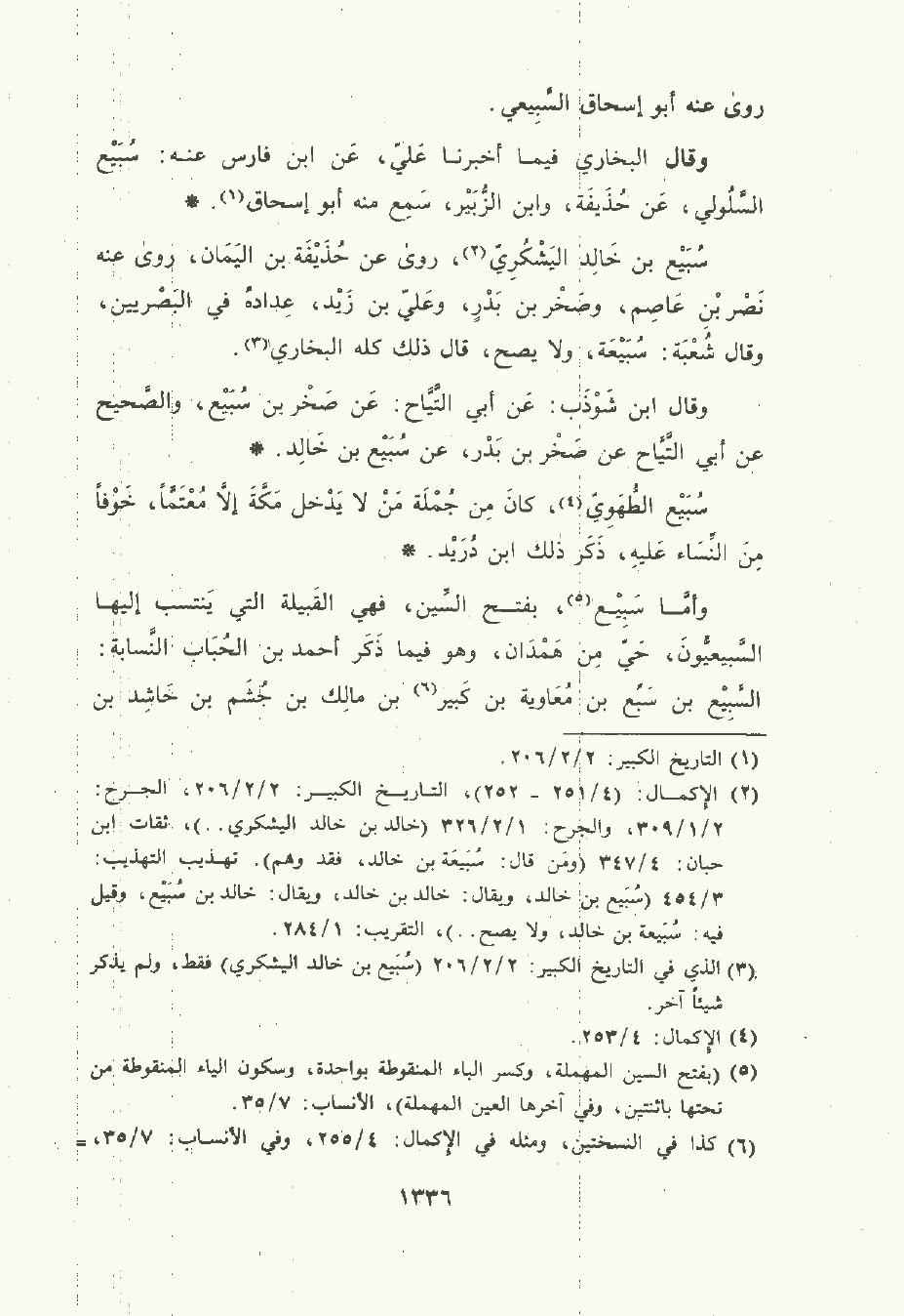 وقال البُخَاريُّ , فيما أَخْبَرنا عَلِيٌّ , عن ابن فَارِس عَنْه: سُبَيْع السلولي , عن حُذَيْفَة , وابن الزُّبَيْر , سَمِعَ مِنْه أبو إِسْحَاق.