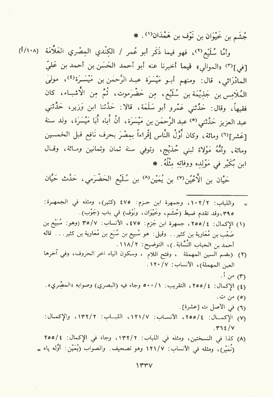 وأمَّا سُلَيْع , فهو فيما ذكر أبو عُمَر الكِنْدي المِصْرِيّ العلامة في الموالي فيما أخبرنا عنه أبو أحمد الحَسَن بن أحمد بن علي المَادْرَائِيّ، قال: ومنهم أبو ميسرة عَبْد الرَّحْمن بن ميسرة مولى الملامس بن جذيمة بن سليع من حَضَرَمَوت , ثم من الأشباء , كان فقيها وقال: حَدَّثني عَمْرو أبو سلمة , قَالا: حَدَّثَنا ابن وزير , حَدَّثني عبد العزيز , حَدَّثني عَبْد الرَّحْمن بن ميسرة أن أباه ميسرة ولد سنة عشر ومِئَة , وكان أول النَّاس إقراءا بمصر بحرف نَافِع قبل الخمسين ومِئَة وأمه مولاة لبني حديج , وتُوفيّ سنة ثمان ومِئَة وقال ابن بُكَيْر في مولده ووفاته مثله.