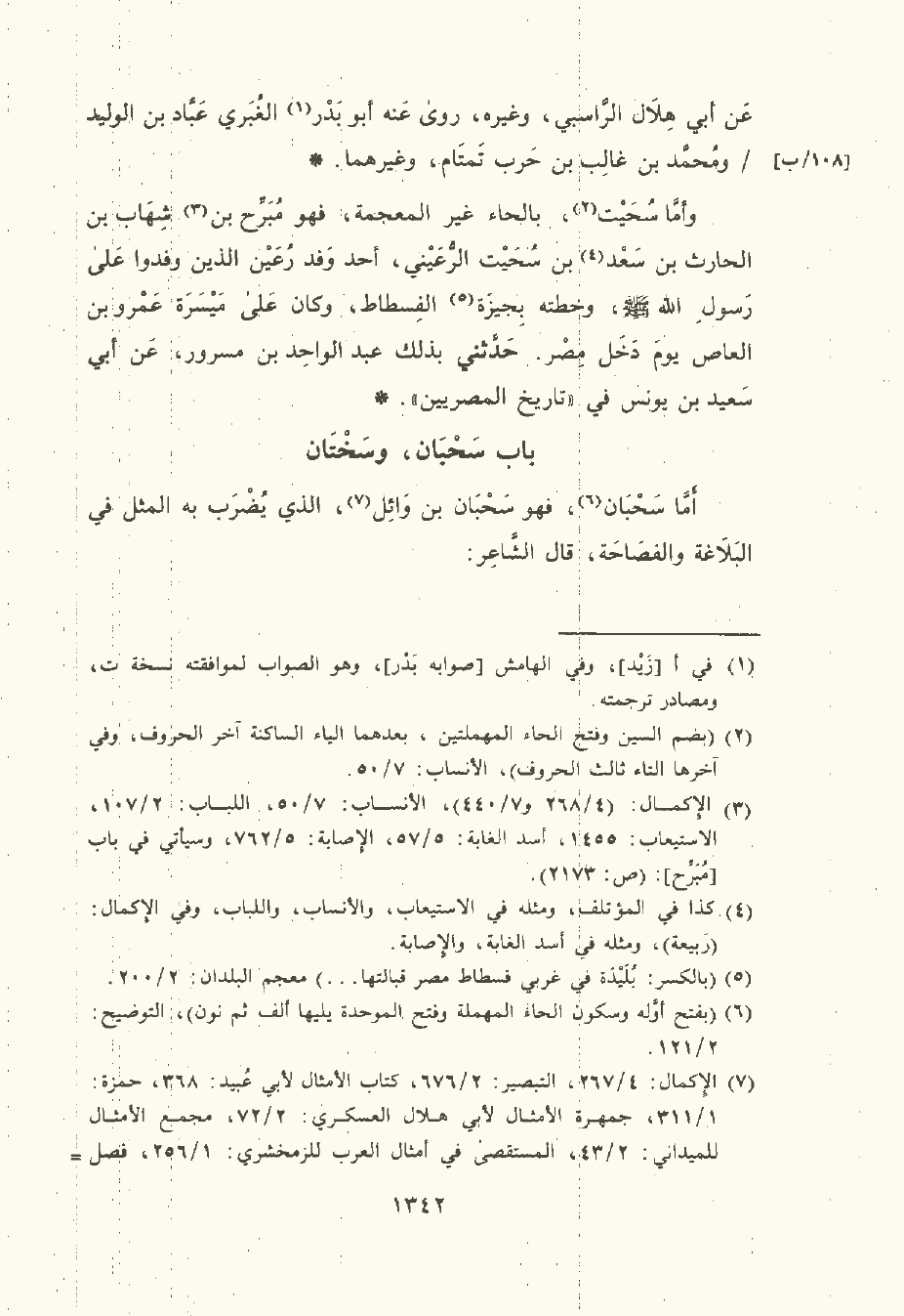 وأمَّا سُحَيْت , بالحاء غير المعجمة , فهو مبرح شهاب بن الحارث بن سَعْد بن سحيت الرعيني , أحد وفد رعين الذين وفدوا على رسول الله صلى الله عليه وسلم , وخطته بجيزة الفسطاط , وكان على ميسرة عَمْرو بن العاص يوم دخل مصر , حَدَّثني بذلك عبد الواحد بن مسرور , عن أبي سَعِيد بن يُونُس في تاريخ المِصْرِيين.