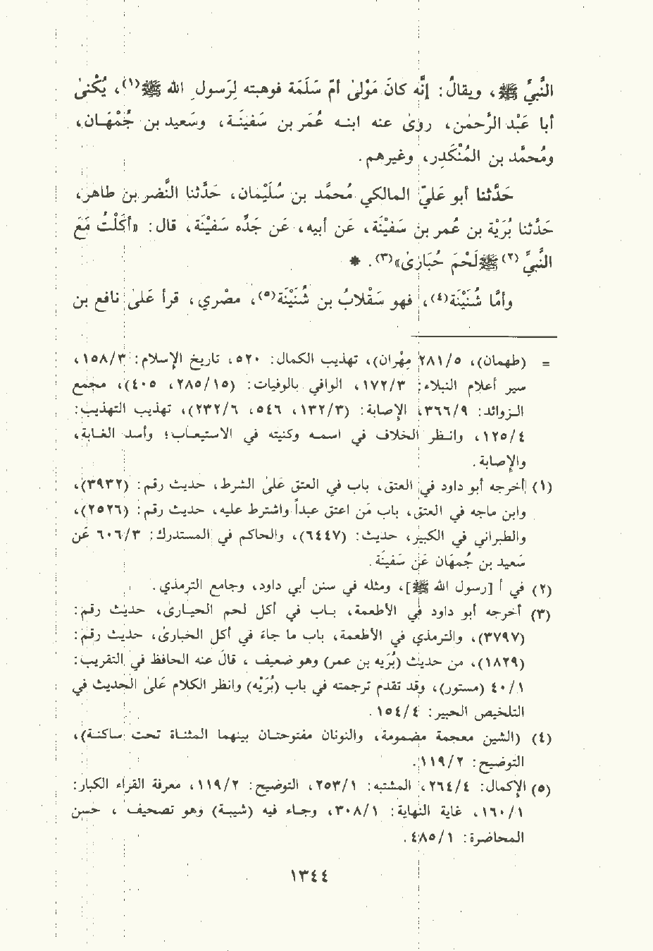 حَدَّثَنا أبو علي المالكي مُحمَّد بن سُلَيْمان , حَدَّثَنا النضر بن طاهر , حَدَّثَنا بُرَيَّة بن عُمَر بن سفينة , عن أبيه , عن جده سفينة قال: "أكلت مع النَّبِيّ صلى الله عليه وسلم لحم حُبارى".