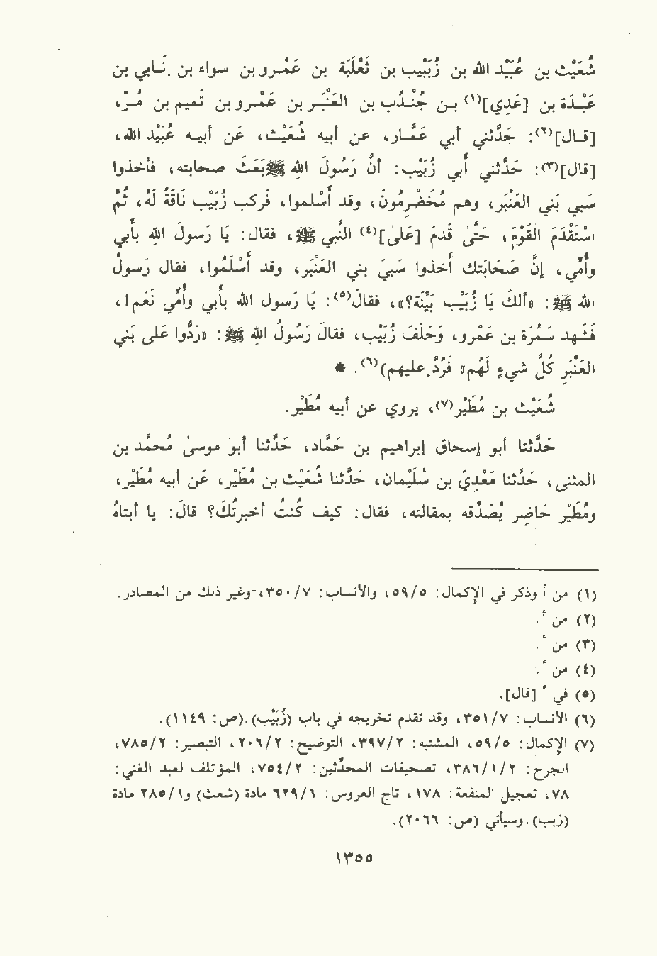 قال: حَدَّثني أبي عمار , عن أبيه شُعَيْث , عن أبيه عبيد الله قال: حَدَّثني أبي زبيب: أن رسول الله صلى الله عليه وسلم بعث صحابته , فأخذوا سبي بني العَنْبَر , وهم مخضرمون , وقد أسلموا , فركب زبيب ناقة له , ثم استقدم القوم حتى قدم على النَّبِيّ صلى الله عليه وسلم فقال: يا رسول الله بأبي وأمي إن صحابتك أخذوا سبي بني العَنْبَر وقد أسلموا , فقال رسول الله صلى الله عليه وسلم: "ألك يا زبيب بينة؟ " فقال: يا رسول الله بأبي وأمي نعم!، فشهد سمرة بن عَمْرو وحلف زبيب فقال رسول الله صلى الله عليه وسلم: "ردوا على بني العَنْبَر كل شيء لهم " فرد عليهم.