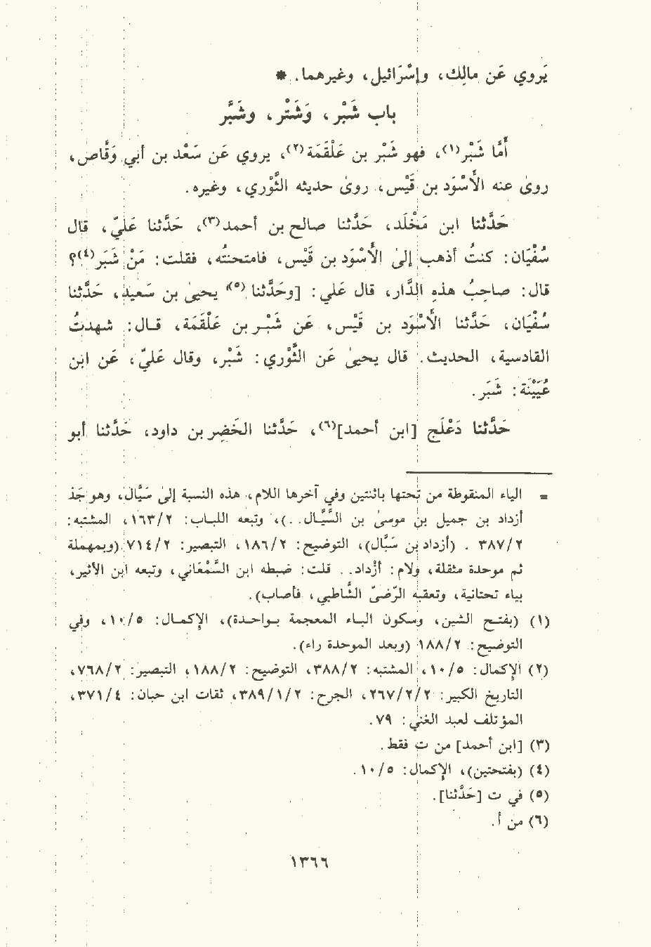 حَدَّثَنا ابن مَخْلَد , حَدَّثَنا صَالِح بن أحمد , حَدَّثَنا علي , قال سُفْيان: كنت أذهب إلى الأَسْود بن قَيْس فأمتحنه فقلت: من شَبْر؟ قال صاحب هذه الدار قال علي وحَدَّثَنا يَحْيى بن سَعِيد , حَدَّثَنا سُفْيان , حَدَّثَنا الأَسْود بن قَيْس , عن شَبْر بن عَلْقَمة قال: شهدت القَادِسِيَّة، الحديث. قال يَحْيى , عن الثَّوْرِيّ: شَبْر , وقال علي , عن ابن عُيَيْنَة: شَبَر.
