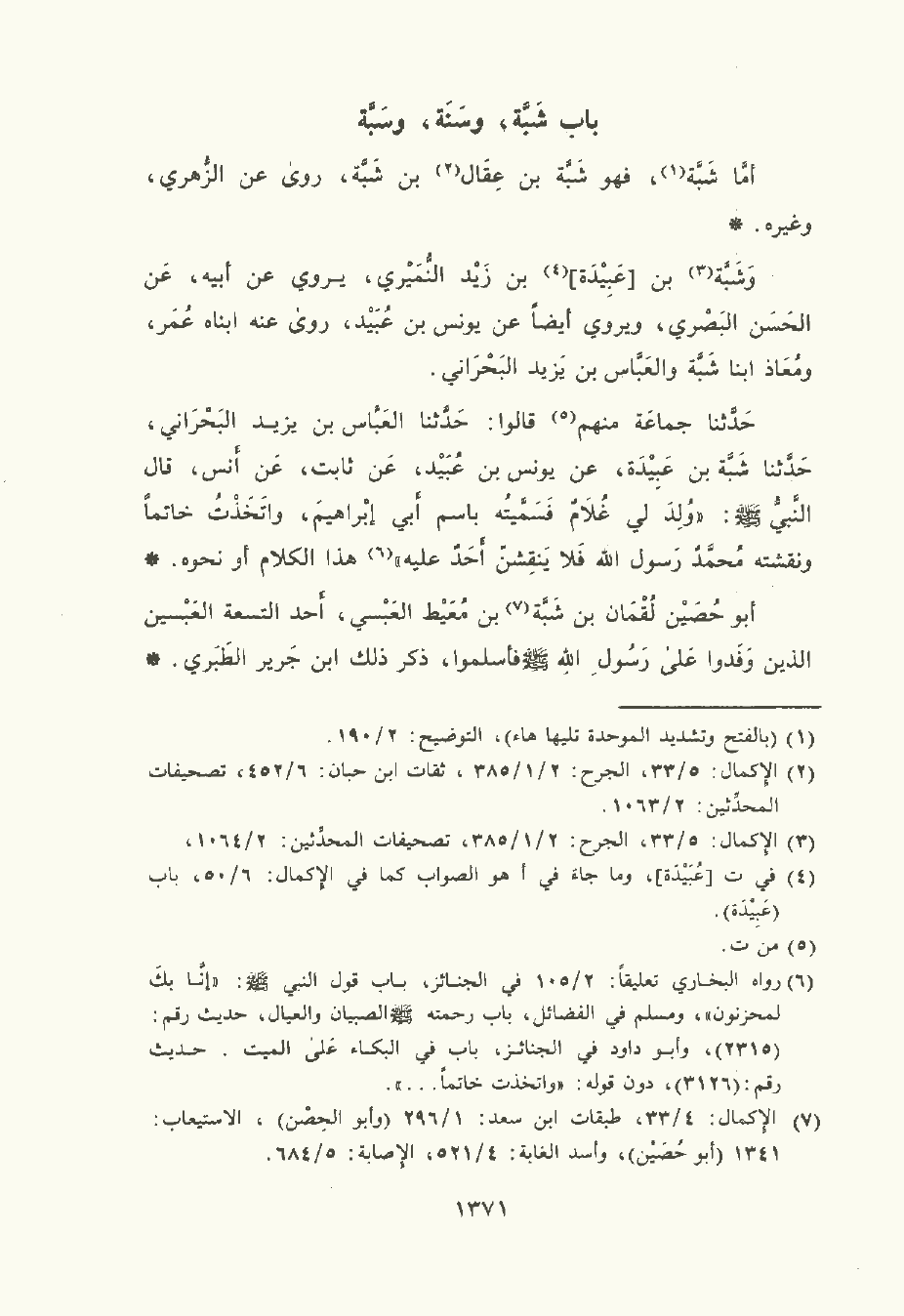 حَدَّثَنا جماعة منهم قالوا: حَدَّثَنا العَبَّاس بن يزيد البحراني , حَدَّثَنا شبة بن عبيدة , عن يُونُس بن عُبَيْد , عن ثابت , عن أنس قال النَّبِيّ صلى الله عليه وسلم: "ولد لي غلام فسميته باسم أبي إبراهيم , واتخذت خاتما , ونقشته مُحمَّد رسول الله صلى الله عليه وسلم , فلا ينقشن أحد عليه " هذا الكلام أو نحوه.