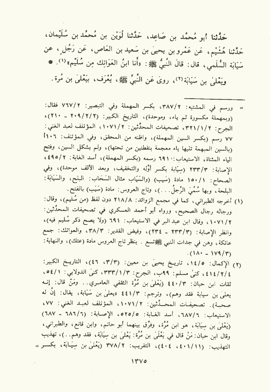 حَدَّثَنا أبو مُحمَّد بن صَاعِد , حَدَّثَنا لُوَيْن بن مُحمَّد بن سُلَيْمان , حَدَّثَنا هشيم , عن عَمْرو بن يَحْيى بن سَعِيد بن العاص , عن رجل , عن سيابة السلمي قال: قال النَّبِيّ صلى الله عليه وسلم: "أنا ابن العواتك من سليم".