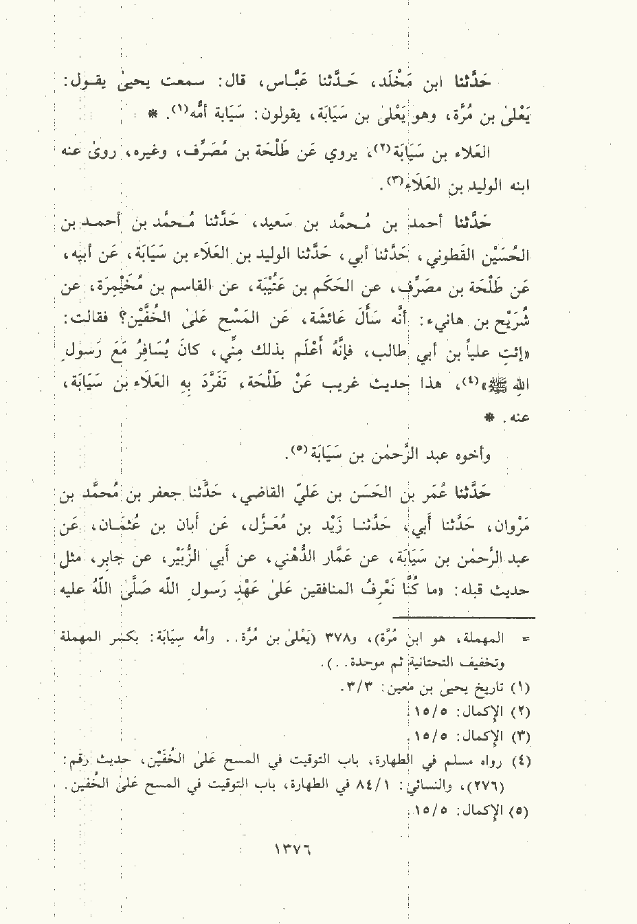 حَدَّثَنا أحمد بن مُحمَّد بن سَعِيد , حَدَّثَنا مُحمَّد بن أحمد بن الحُسَين القطوني , حَدَّثَنا أبي , حَدَّثَنا الوليد بن العلاء بن سيابة , عن أبيه , عن طَلْحَة بن مصرف , عن الحكم بن عتيبة , عن القَاسِم بن مخيمرة , عن شُرَيْح بن هانىء: أنه سأل عائشة عن المسح على الخفين؟ فقالت: "إئت عليا بن أبي طالب فإنه أعلم بذلك مني , كان يسافر مع رسول الله صلى الله عليه وسلم "، هذا حديث غريب عن طَلْحَة , تفرد به العلاء بن سيابة عنه.