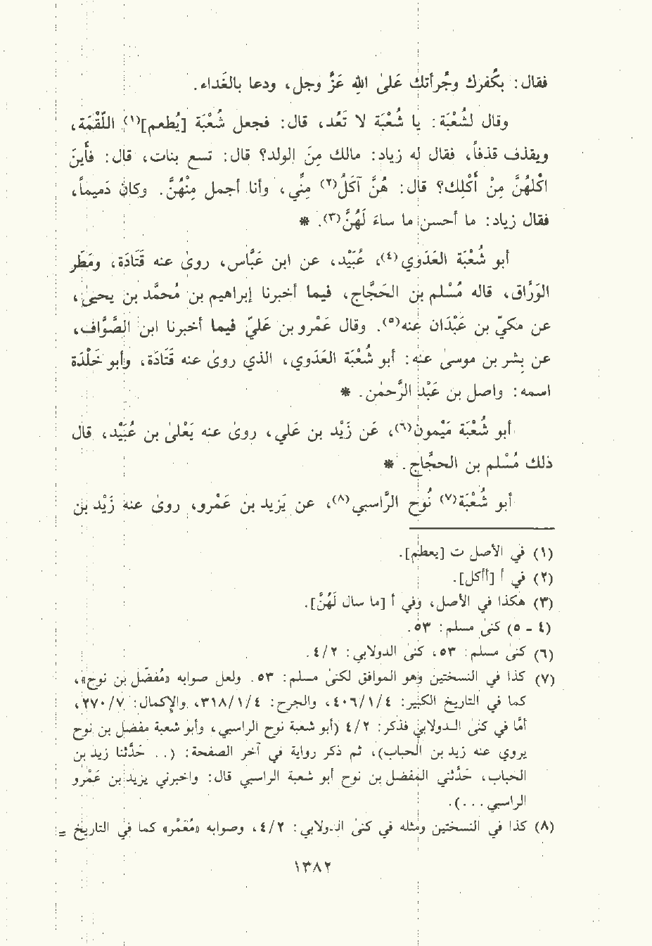 أبو شُعْبة العَدَوِيّ عبيد , عن ابن عَبَّاس , رَوَى عَنْه قَتَادَة ومطر الوراق , قاله مُسْلم بن الحَجَّاج فيما أخبرنا إبراهيم بن مُحمَّد بن يَحْيى , عن مكي بن عبدان عنه. وقال عَمْرو بن علي فيما أخبرنا ابن الصَّوَّاف , عن بِشْر بن موسى عنه: أبو شُعْبة العَدَوِيّ , الذي رَوَى عَنْه قَتَادَة , وأبو خلدة اسمه: واصل بن عبد الرَّحْمن.