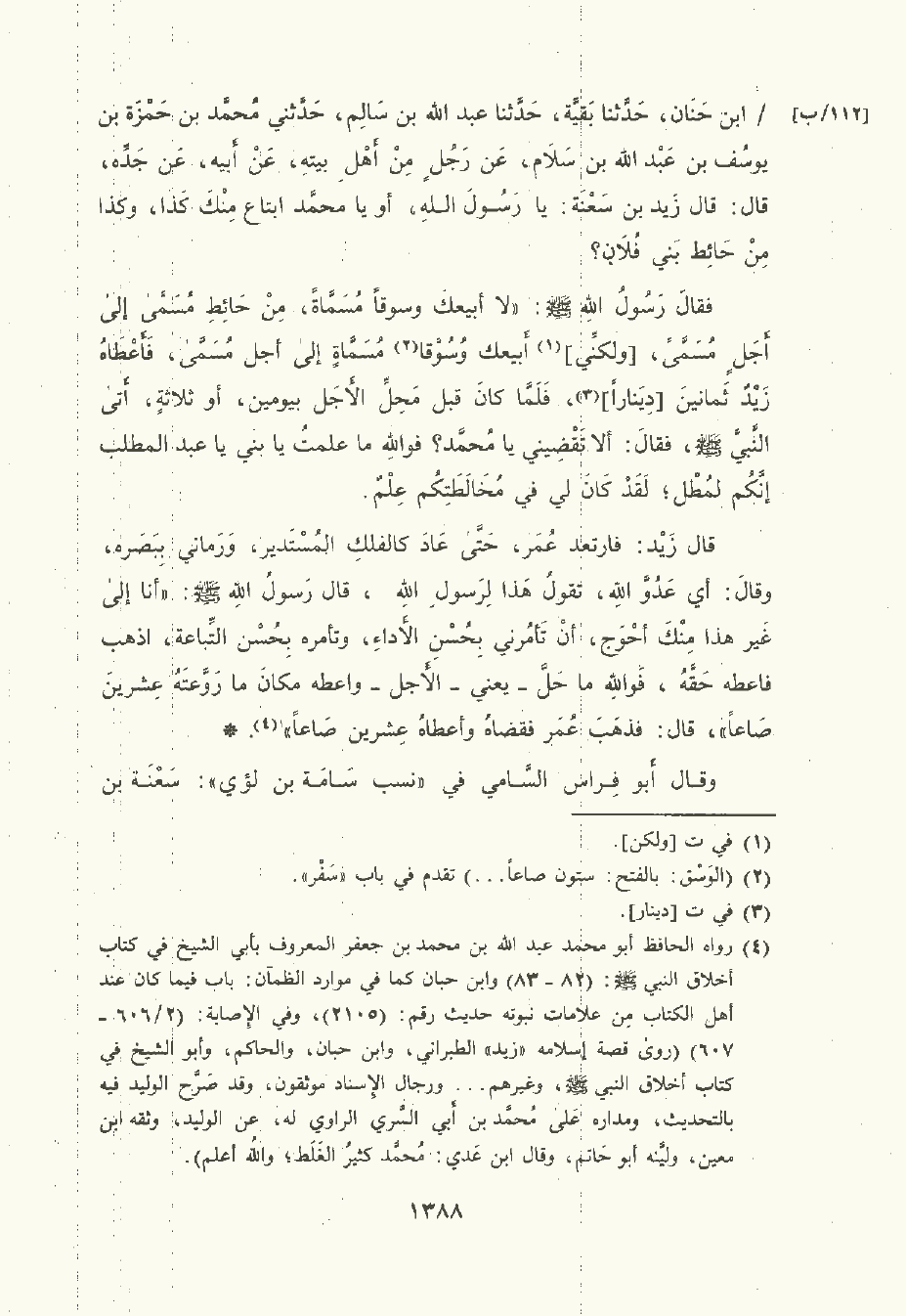 فقال رسول الله صلى الله عليه وسلم: "لا أبيعك وسوقا مسماة من حائط مسمى إلى أجل مسمى , ولكني أبيعك وسوقا مسماة إلى أجل مسمى , فأعطاه زيد ثمانين دينارا , فلما كان قبل محل الأجل بيومين أو ثلاثة أتى النَّبِيّ صلى الله عليه وسلم فقال: ألا تقضيني يا مُحمَّد؟ فوالله ما علمت يا بني يا عبد المطلب إنكم لمطل لقد كان لي في مخالطتكم علم.