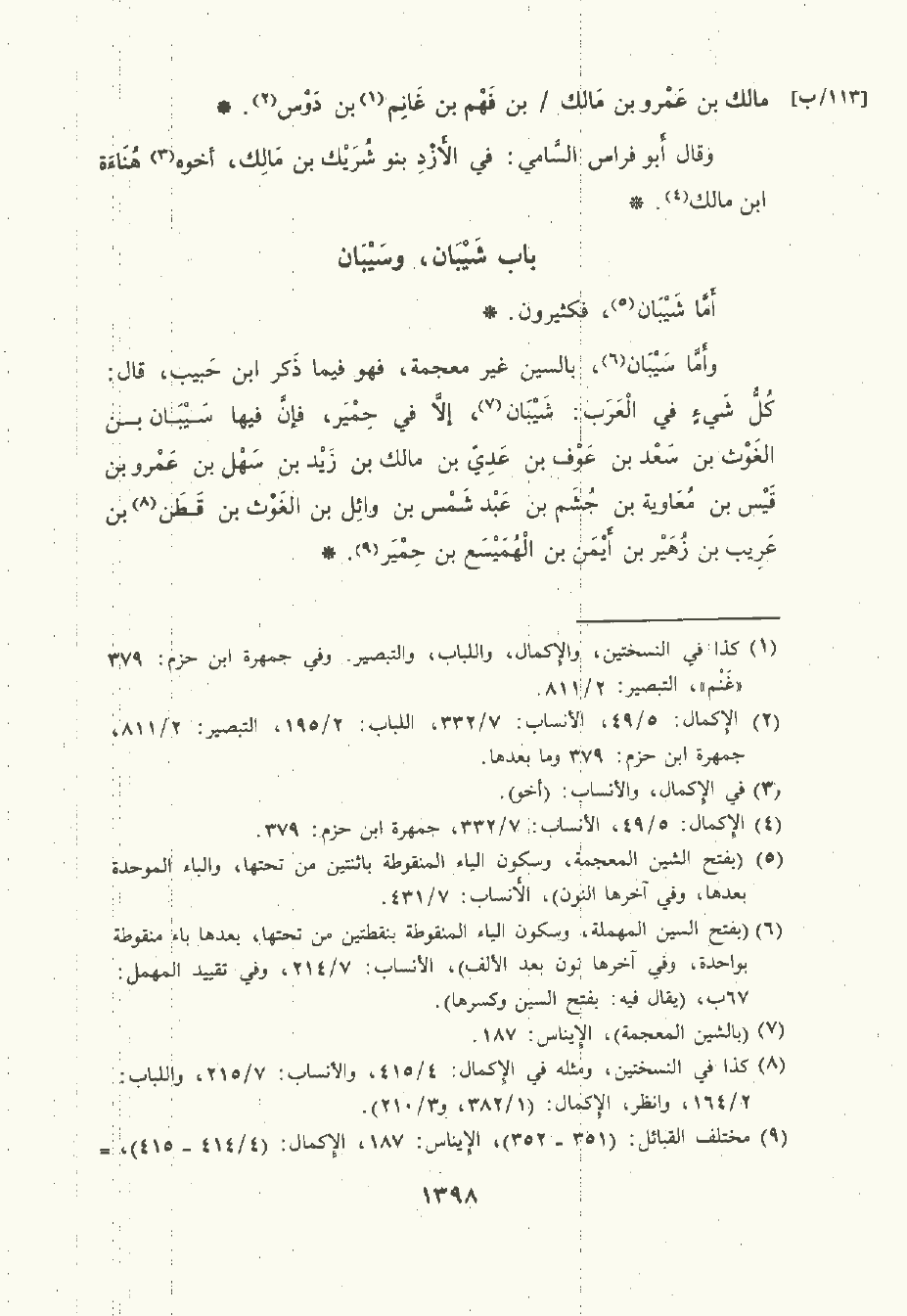 وأمَّا سَيْبَان , بالسين غير معجمة , فهو فيما ذكر ابن حبيب قال: كل شيء في العرب: شيبان , إلا حِمْيَر فإن فيها سيبان بن الغوث بن سَعْد بن عَوْف بن عدي بن مَالِك بن زيد بن سَهْل بن عَمْرو بن قَيْس بن مُعَاوية بن جشم بن عَبْد شَمْس بن وَائِل بن الغوث بن قطن بن عريب بن زهير بن أيمن بن الهميسع بن حمير.