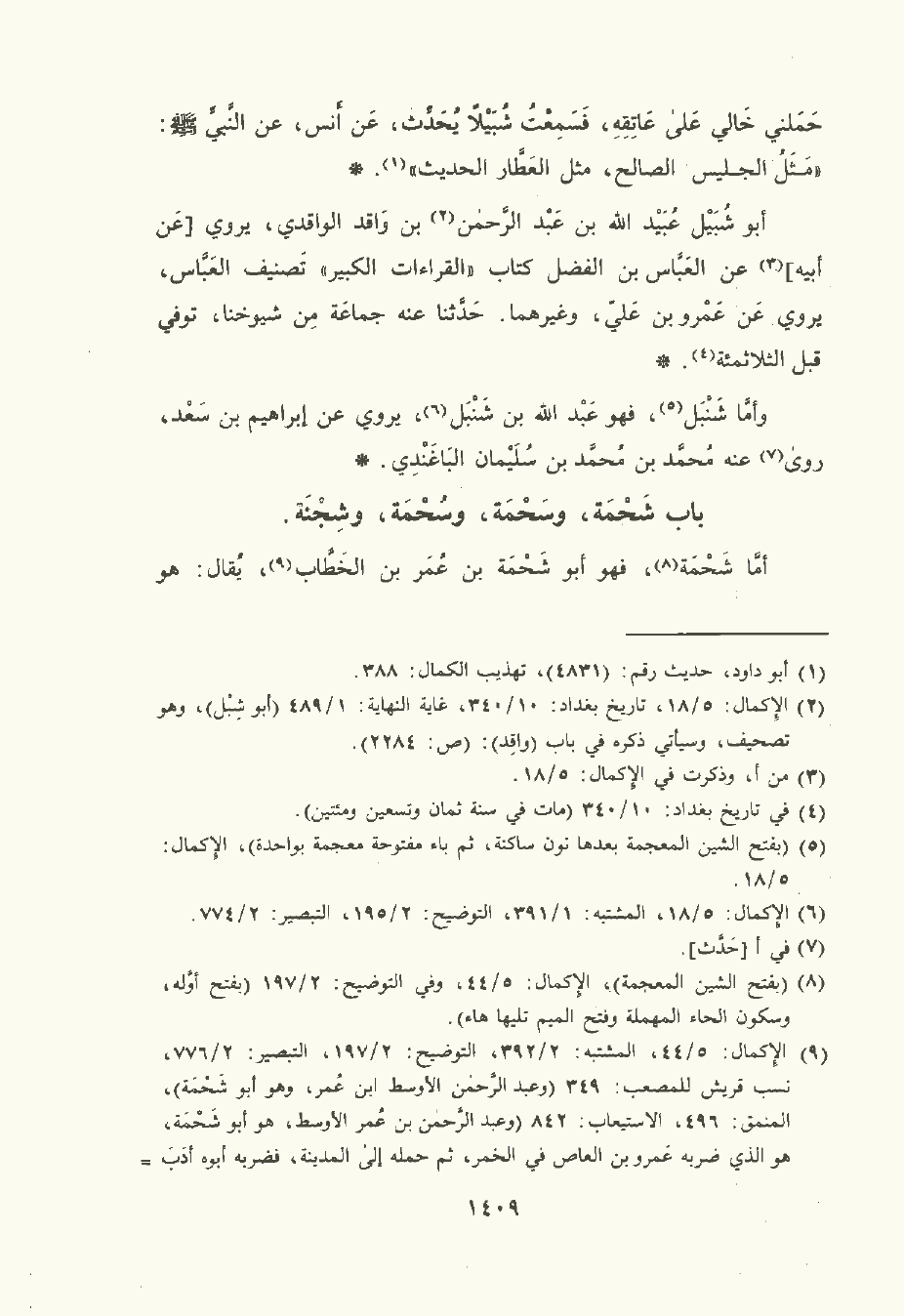 وأمَّا شَنْبَل , فهو عَبد الله بن شنبل , يَرْوي عن إبراهيم بن سَعْد , رَوَى عَنْه مُحمَّد بن مُحمَّد بن سُلَيْمان الباغندي.
