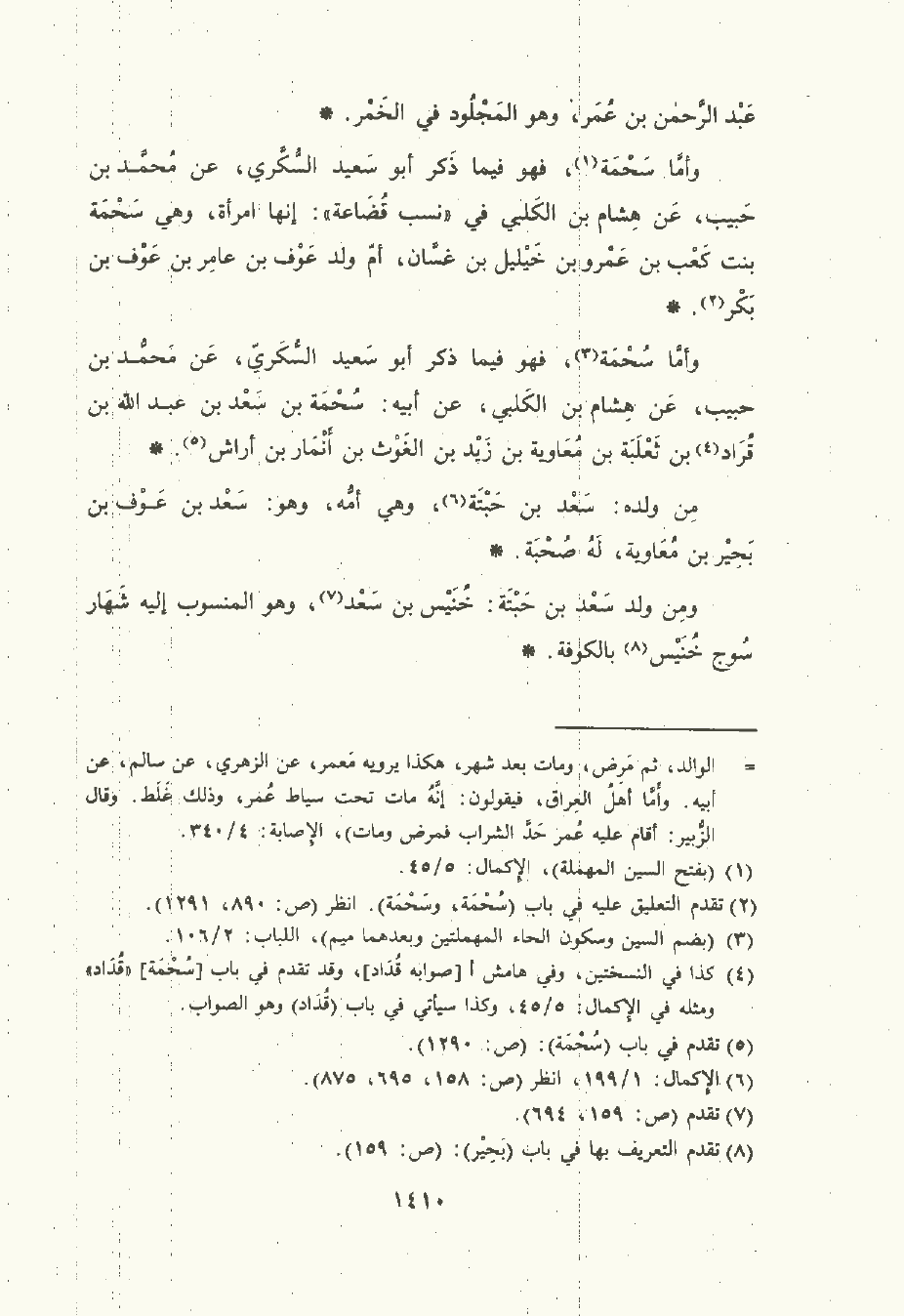 وأمَّا سُحْمَة , فهو فيما ذكر أبو سَعِيد السُّكريّ , عن مُحمَّد بن حبيب , عن هشام بن الكَلْبيّ , عن أبيه: سحمة بن سَعْد بن عَبد الله بن قراد بن ثَعْلَبة بن مُعَاوية بن زيد بن الغوث بن أنمار بن أراش.