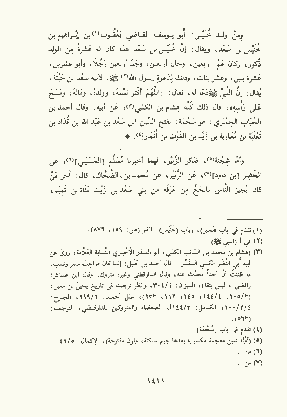 ومن ولد خنيس: أبو يُوسُف القاضي يعقوب بن إبراهيم بن خنيس بن سَعْد , ويقال: إن خنيس بن سَعْد هذا كان له عشرة من الولد ذكور , وكان عم أربعين وخال أربعين وجد أربعين رجلا , وأبو عشرين عشرة بنين وعشر بنات وذلك لدعوة رسول الله صلى الله عليه وسلم لأبيه سَعْد بن حبتة يقال: إن النَّبِيّ صلى الله عليه وسلم دعا له فقال: "اللهم أكثر نسله وولده وماله ومسح على رأسه " قال ذلك كله هشام بن الكَلْبيّ , عن أبيه. وقال أحمد بن الحُبَاب الحِمْيَري: هو سَحْمَة: بفتح السين ابن سَعْد بن عَبد الله بن قداد بن ثَعْلَبة بن مُعَاوية بن زيد بن الغوث بن أنمار.