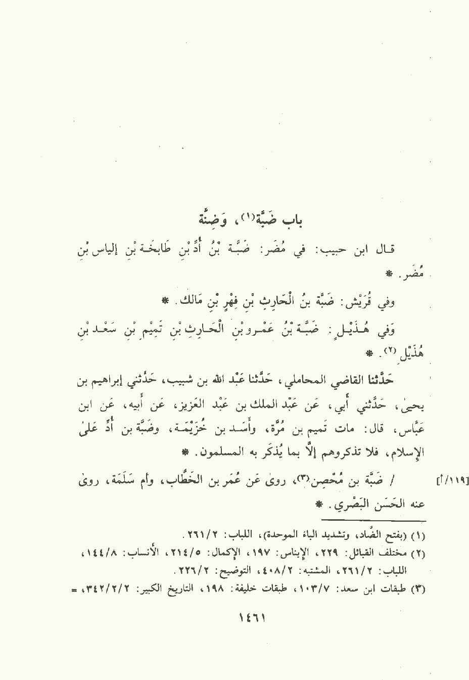 قال ابن حبيب في مضر: ضَبَّة بن أد بن طابخة بن إلياس بن مُضَر.