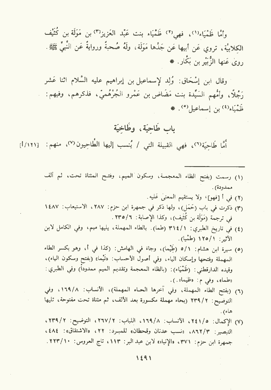 وقال ابن إِسْحَاق: ولد لإسماعيل بن إبراهيم عليه السَّلام اثنا عشر رجلا وأمهم السيدة بنت مضاض بن عَمْرو الجرهمي , فذكرهم وفيهم: ظمياء بن إِسْمَاعِيل.