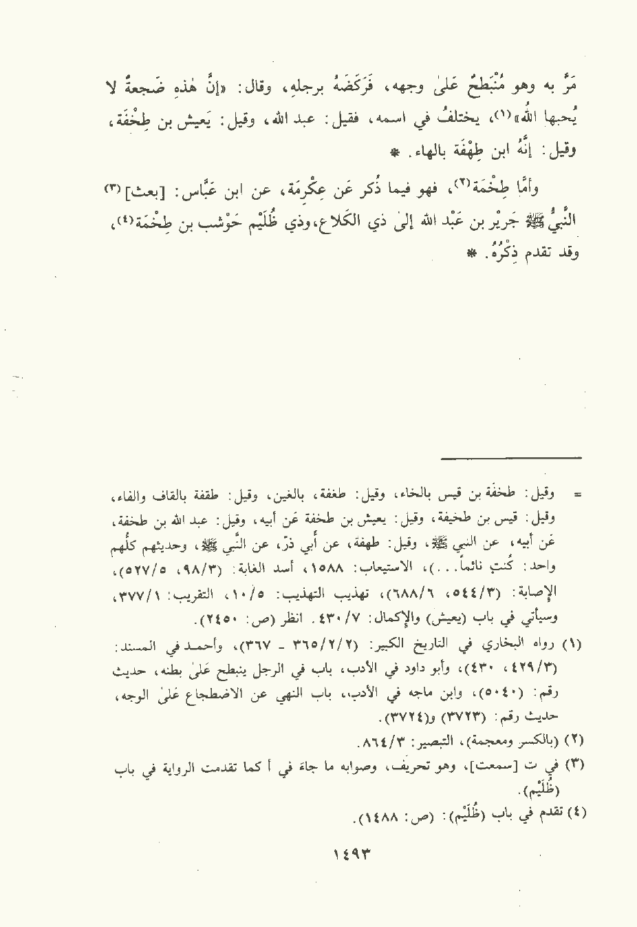 رَوَى عن النَّبِيِّ صلى الله عليه وسلم: أنه مر به وهو منبطح على وجهه , فركضه برجله وقال: "إن هذه ضجعة لا يحبها الله " يختلف في اسمه فقيل: عَبد الله وقيل: يعيش بن طخفة وقيل: إنه ابن طهفة , بالهاء.