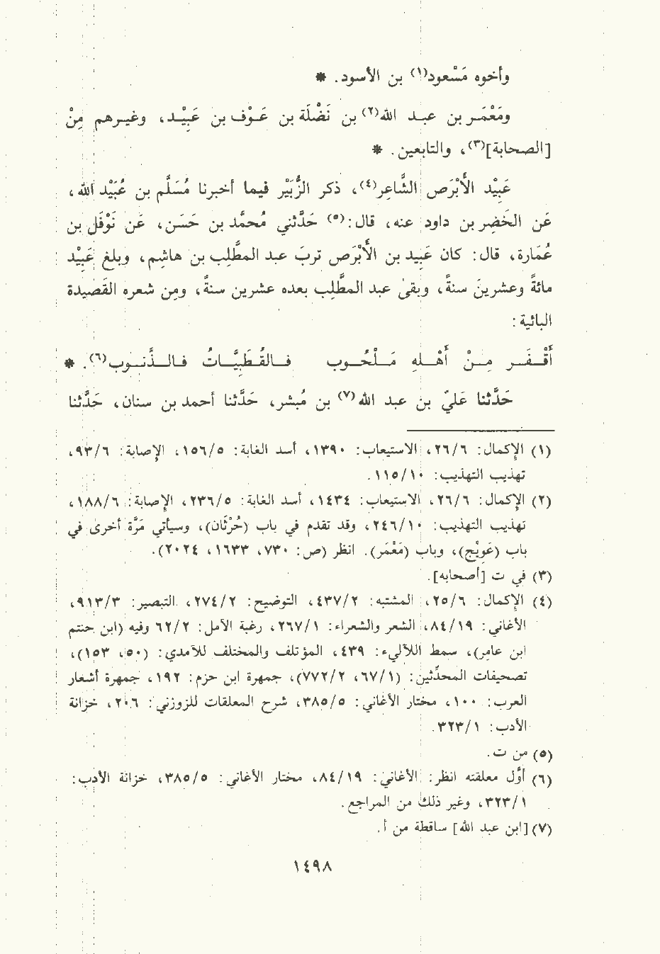 عَبِيد الأبرص الشَّاعِر , ذكر الزُّبَيْر فيما أخبرنا مسلم بن عبيد الله , عن الخضر بن داود عنه , قال: حَدَّثني مُحمَّد بن حَسَن , عن نوفل بن عمارة , قال: كان عَبِيد بن الأبرص تربَ عبد المطلب بن هاشم , وبلغ عَبِيد مِئَة وعشرين سنة , وبقي عبد المطلب بعده عشرين سنة , ومن شعره القصيدة البائية: