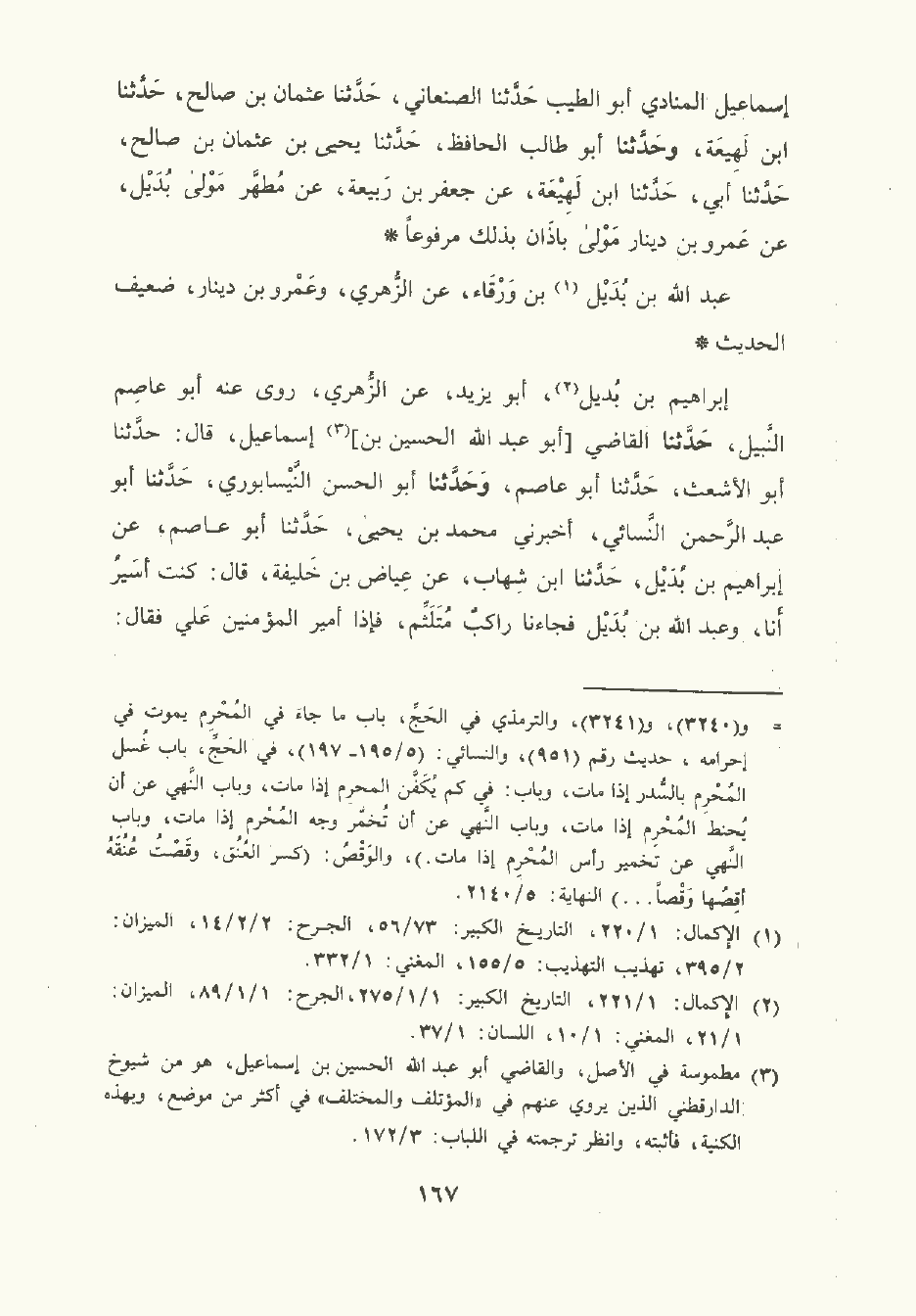 إبراهيم بن بُدَيْل أبو يزيد , عن الزُّهْري، رَوَى عنه أبو عاصم النَّبِيل، حَدَّثَنا القاضي أبو عبد الله الحُسَين بن إسماعيل قال: حَدَّثَنا أبو الأشعث , حَدَّثَنا أبو عاصم , وحدثنا أبو الحسن النَّيْسَابوري , حَدَّثَنا أبو عبد الرَّحْمن النَّسَائي , أَخْبَرني مُحمَّد بن يَحْيى , حَدَّثَنا أبو عاصم , عن إبراهيم بن بُدَيْل , حَدَّثَنا ابن شِهَاب , عن عِياض بن خَلِيفة قال: كنت أسير أنا وعَبد الله بن بُدَيْل فجاءنا راكب مُتَلَثِّم فإذا أمير المؤمنين علي فقال: العقل في القلب والرحمة في الكبد والرأفة في الطحال والنَّفَس في الرئة.