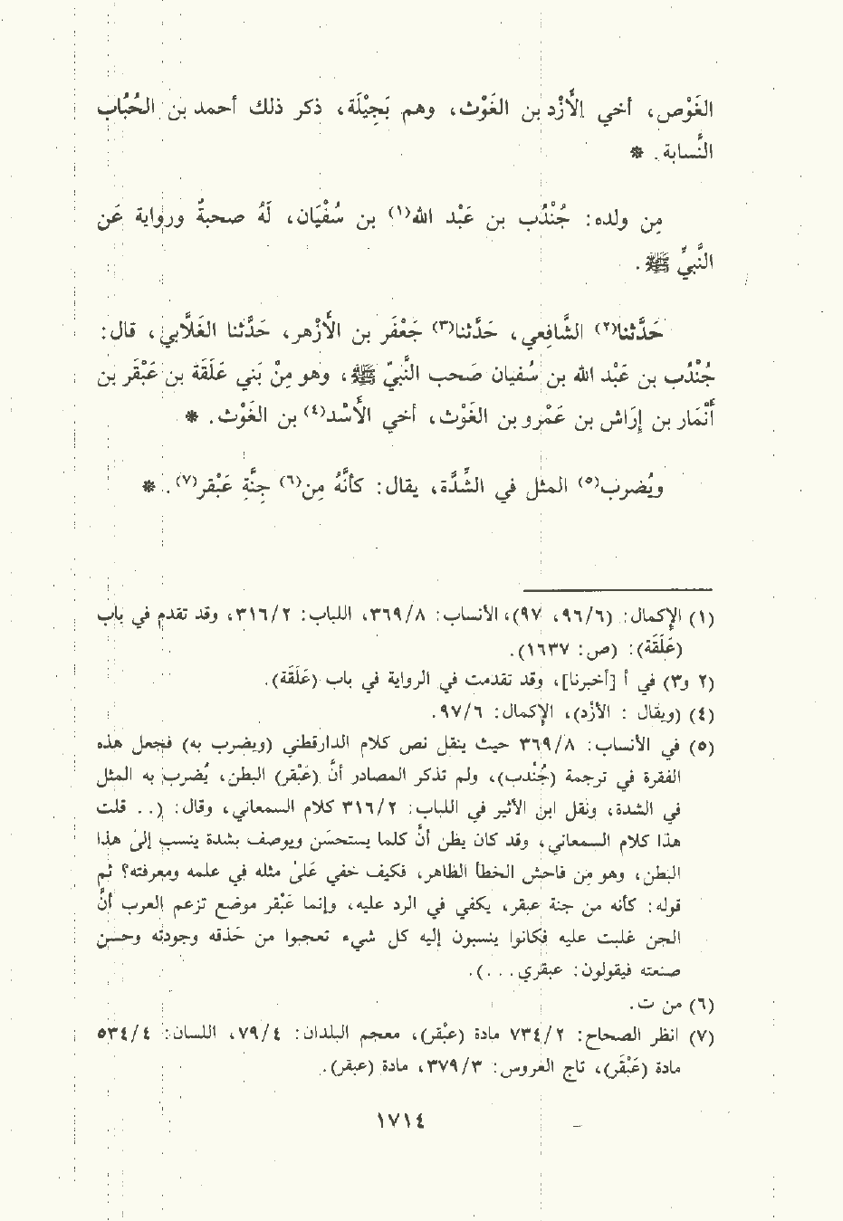 حَدَّثَنا الشَّافِعي , حَدَّثَنا جَعْفر بن الأَزْهَر , حَدَّثَنا الغلابي , قال: جندب بن عَبد الله بن سُفْيان , صحب النَّبِيّ صلى الله عليه وسلم , وهو من بني عَلَقَة بن عَبْقَر بن أنمار بن إراش بن عَمْرو بن الغوث , أخي الأسد بن الغوث.