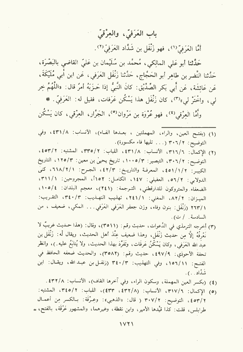 حَدَّثَنا أبو علي المالكي مُحمَّد بن سُلَيْمان بن عَليّ القاضي بالْبَصْرة , حَدَّثَنا النضر بن طاهر أبو الحجاج , حَدَّثَنا زنفل العرفي , عن ابن أبي مُلَيْكة , عن عائشة , عن أبي بَكْر الصِّدِّيق: كان النَّبِيّ صلى الله عليه وسلم إذا حزبه أمر , قال: "اللهم خر لي واختر لي "، كان زنفل هذا يسكن عرفات فقيل له: العرفي.