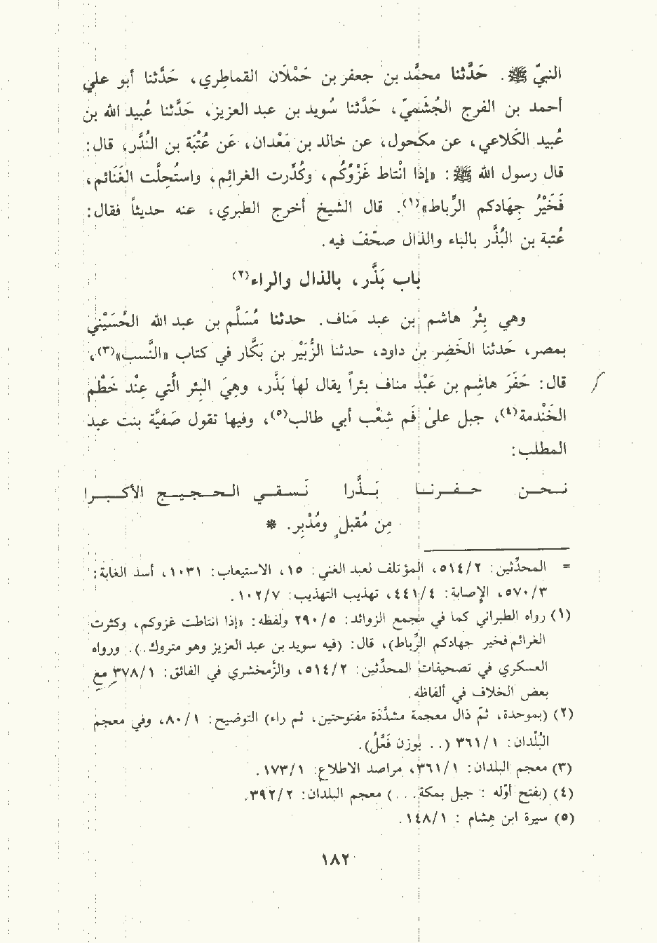, حَدَّثَنا مُحمَّد بن جَعْفَر بن حَمْلان القماطِري، حَدَّثَنا أبو علي أحمد بن الفرج الجُشَميّ , حَدَّثَنا سُوَيد بن عبد العزيز , حَدَّثَنا عُبَيد الله بن عُبَيْد الكَلاَعِيّ , عن محكول , عن خالد بن مَعْدَان , عن عُتْبَة بن النُّدَّر قال: قال رسول الله صلى الله عليه وسلم: إذا انتاط غزوكم وكدرت الغرائم واستحلت الغنائم فخير جهادكم الرباط.