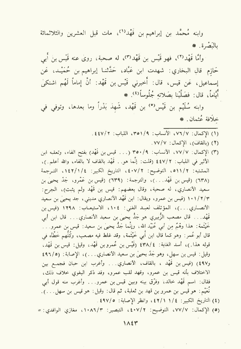 وأمَّا قَهْد , فهو قَيْس بن قهد , له صُحْبة , رَوَى عَنْه قَيْس بن أبي حَازِم قال البُخَاريُّ: شهدت ابن عباد , حَدَّثَنا إبْرَاهِيم بن حُمَيْد , عن إِسْمَاعِيل , عن قَيْس , قال: أخبرني قَيْس بن قهد: أن إماما لهم اشتكى أياما , قال: فصلينا بصلاته جلوسا.