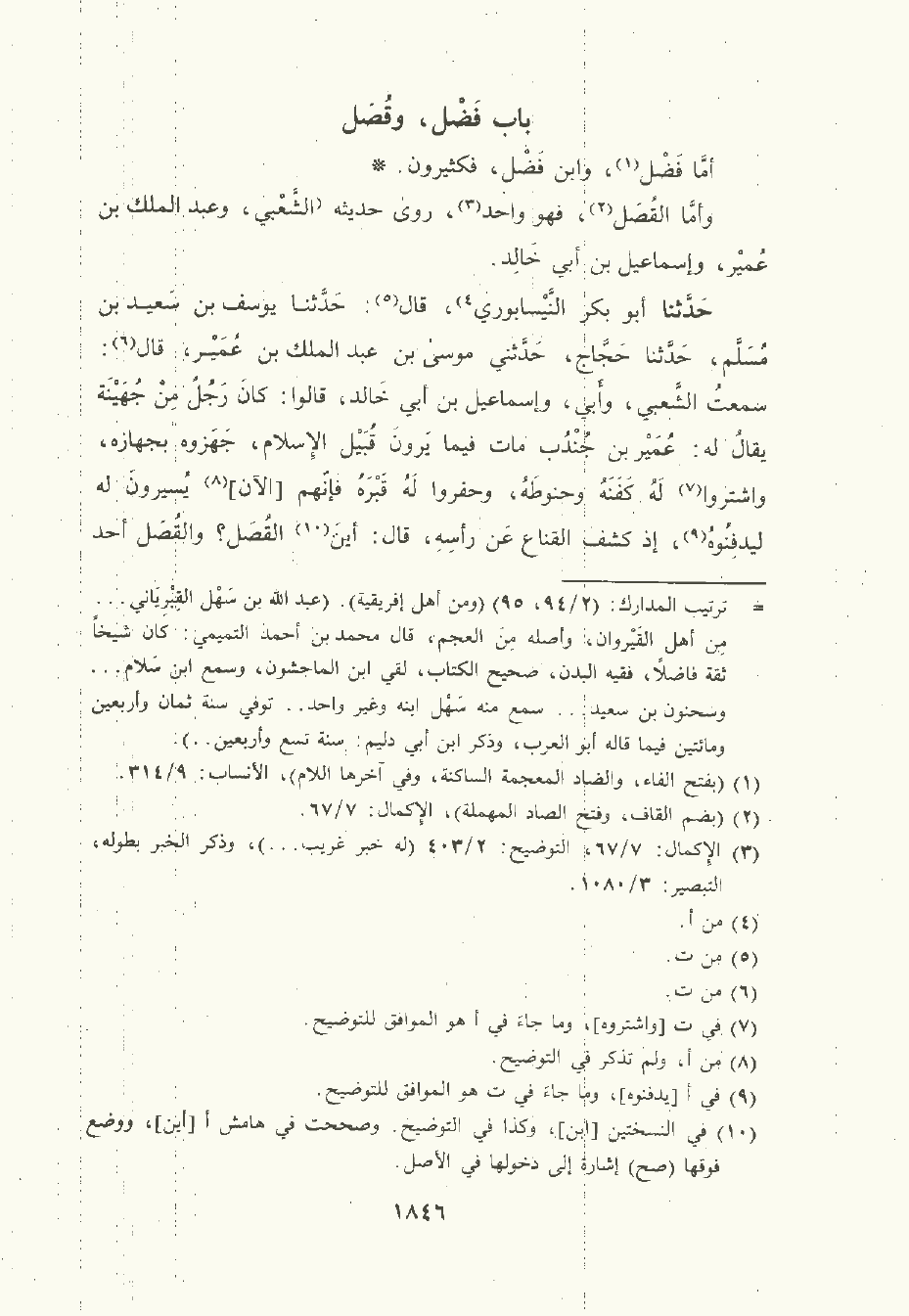 حَدَّثَنا أبو بَكْر النَّيْسَابوري , قال: حَدَّثَنا يُوسُف بن سَعِيد بن مُسْلِم , حَدَّثَنا حَجَّاج , حَدَّثني موسى بن عَبد المَلِك بن عُمَيْر , قال: سَمِعتُ الشَّعْبيّ , وأبي , وإسماعيل بن أبي خالد قالوا: كان رجل من جهينة يقال له: عُمَيْر بن جندب , مات فيما يرون قبيل الإِسْلاَم جهزوه بجهازه واشتروا له كفنه وحنوطه وحفروا له قبره فإنهم الآن يسيرون له ليدفنوه إذ كشف القناع عن رأسه، قال: أين القصل؟ والقصل أحد بني عمه.
