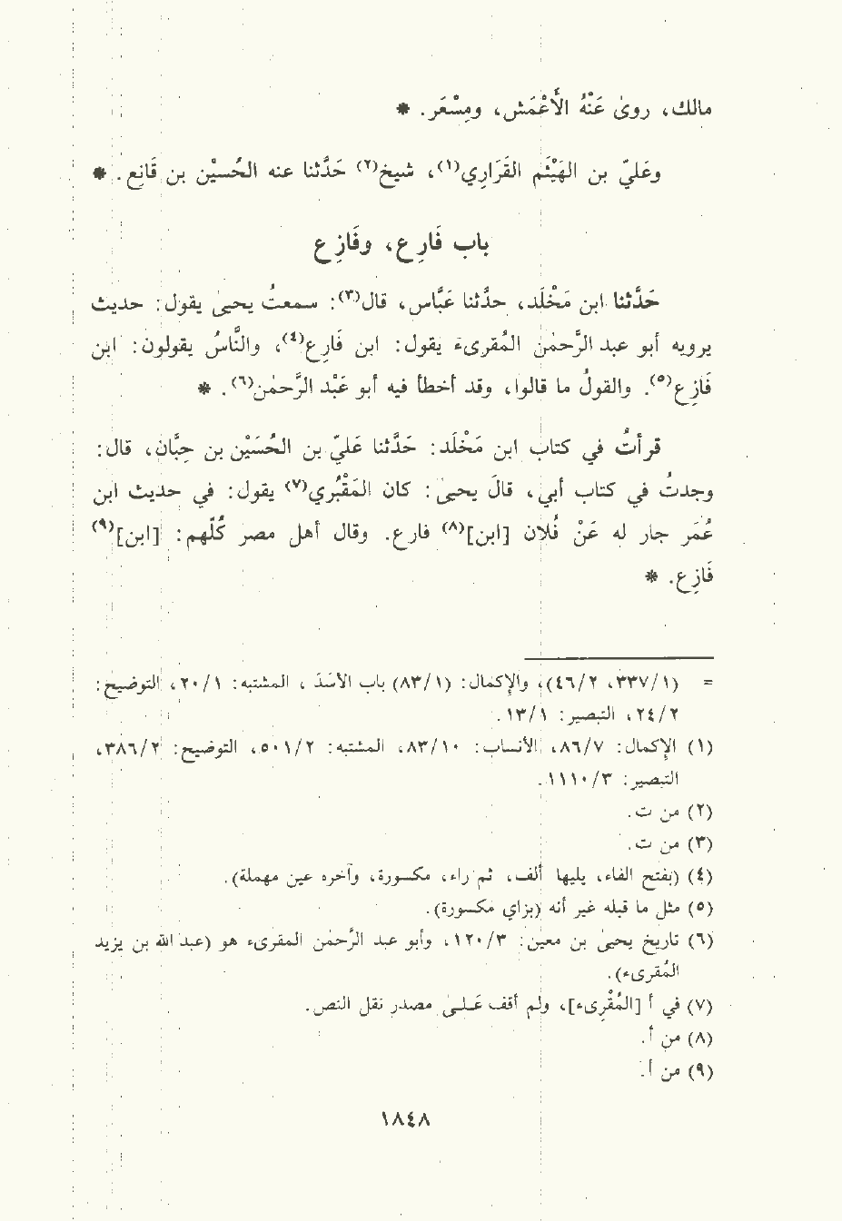 قرأت في كتاب ابن مخلد: حَدَّثَنا عَلِيّ بن الحُسَين بن حبان , قال: وجدت في كتاب أبي قال يَحْيى: كان المَقْبُرِيّ يقول: في حديث ابن عُمَر جار له , عن فلان ابن فارع. وقال أهل مِصْر كلهم: ابن فازع.