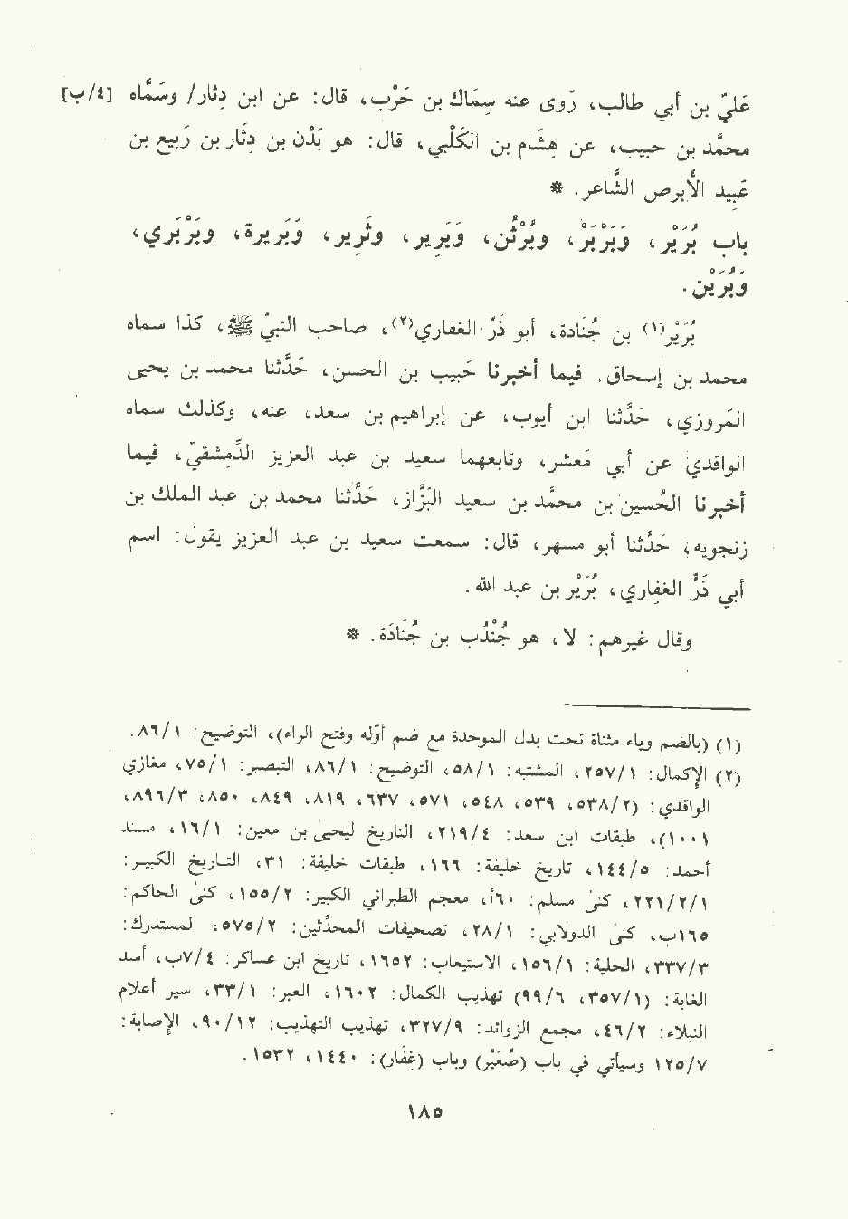 بُرَيْر بن جُنَادة أبو ذَرّ الغِفَاري صاحب النَّبِيّ صلى الله عليه وسلم كذا سماه مُحمَّد بن إسحاق. فيما أخبرنا حبيب بن الحسن , حَدَّثَنا مُحمَّد بن يَحْيى المَرْوَزِيُّ , حَدَّثَنا ابن أَيُّوب , عن إبراهيم بن سَعْد عنه وكذلك سَمَّاه الوَاقِديّ , عَن أبي معشر وتابعهما سَعِيد بن عبد العزيز الدِّمَشْقي فيما أخبرنا الحُسَين بن مُحمَّد بن سَعِيد البَزَّاز , حَدَّثَنا مُحمَّد بن عبد الملك بن زَنْجَوَيْهِ , حَدَّثَنا أبو مسهر قال: سَمِعتُ سَعِيد بن عبد العزيز يقول: اسم أبي ذر الغِفَاري بُرَيْر بن عبد الله.