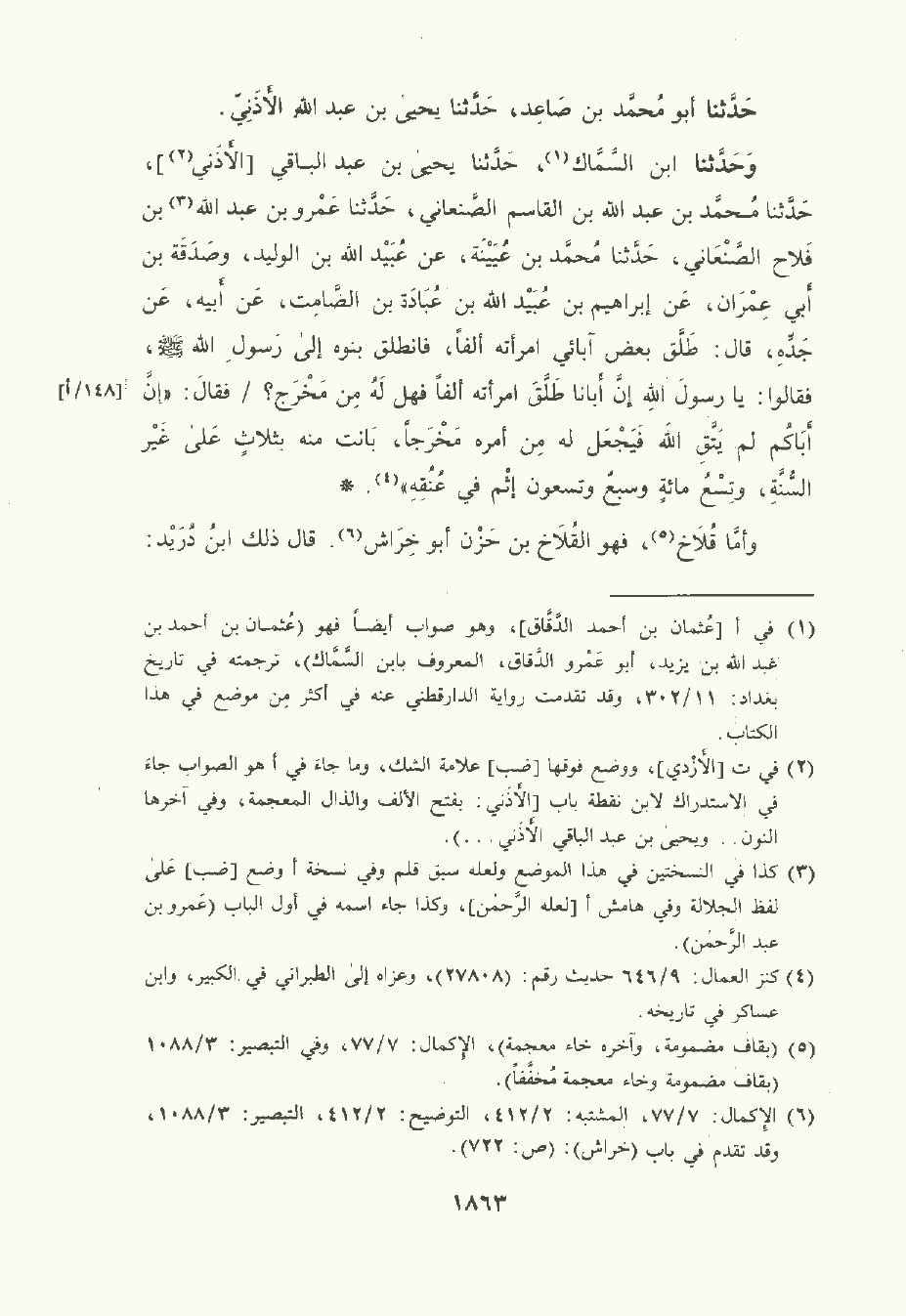 وحَدَّثَنا ابن السَّمَّاك , حَدَّثَنا يَحْيى بن عبد الباقي الأذني , حَدَّثَنا مُحمَّد بن عَبد الله بن القَاسِم الصَّنْعَانِيّ , حَدَّثَنا عَمْرو بن عَبد الله بن فلاح الصَّنْعَانِيّ , حَدَّثَنا مُحمَّد بن عُيَيْنَة , عن عُبَيْد الله بن الوَلِيد , وصدقة بن أبي عِمْرَان , عن إبْرَاهِيم بن عُبَيْد الله بن عُبَادة بن الصَّامت , عن أبيه , عن جده , قال: طَلَّق بعض آبائي امرأته ألفا فانطلق بنوه إلى رسول الله صلى الله عليه وسلم فقالوا: يا رسول الله إن أبانا طلق امرأته ألفا فهل له من مخرج؟ فقال: " إن أباكم لم يتق الله فيجعل له من أمره مخرجا , بانت منه بثلاث على غير السنة وتسع مِئَة وسبع وتسعون إثم في عنقه ".