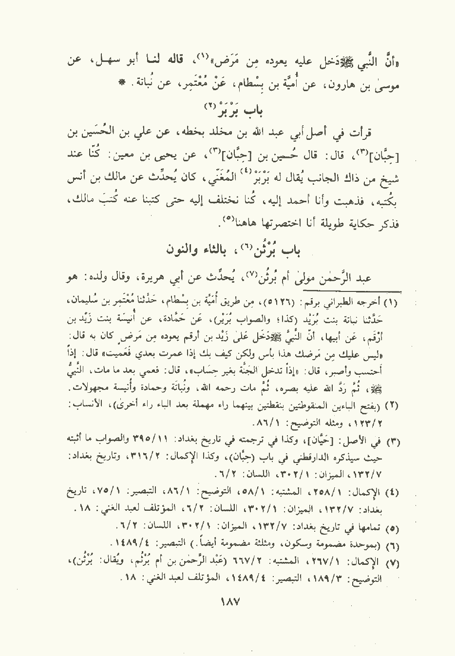 قرأت في أصل أبي عَبد الله بن مَخْلَد بخطه , عن علي بن الحُسَين بن حِبَّان قال: قال حُسَين بن حبان , عن يَحْيى بن مَعِين كنا عند شيخ من ذاك الجانب يقال له بربر المُغَنّي كان يحدث عن مالك بن أنس بكتبه , فذهبت وأنا أحمد إليه , كنا نختلف إليه كتبنا عنه كتب مالك , فذكر حكاية طويلة أنا اختصرتها هاهنا.