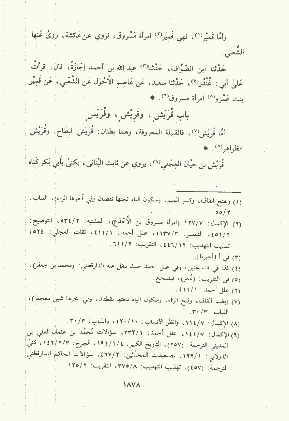 حَدَّثَنا ابن الصَّوَّاف , حَدَّثَنا عَبد الله بن أحمد إجازة , قال: قرأت على أبي: غُنْدَر , حَدَّثَنا سَعِيد , عن عَاصِم الأحول , عن الشَّعْبيّ , عن قَمِير بنت عَمْرو امرأة مسروق.