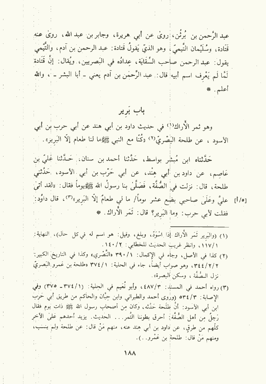 حدثناه ابن مُبَشر بواسط , حَدَّثَنا أحمد بن سنان , حَدَّثَنا علي بن عَاصِم , عن داود بن أبي هِنْد , عَن أبي حرب بن أبي الأَسْود حَدَّثني طَلْحة قال: نزلت في الصُّفَّة فصلى بنا رسول الله صلى الله عليه وسلم يوما فقال: لقد أتى علي وعلى صاحبي بضع عشر يوما , ما لي طعام إلا البَرِير، قال دَاودُ: فقلت لأبي حَرْب: وما البَرِير؟ قال: ثمر الأَرَاك.