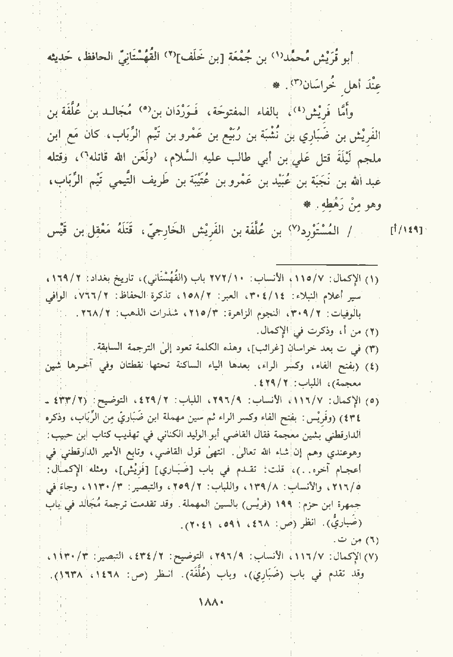 وأمَّا فَرِيش , بالفاء المفتوحة , فوردان بن مُجَالِد بن عُلَّفَة بن الفَرِيش بن ضباري بن نشبة بن ربيع بن عَمْرو بن تيم الرباب , كان مع ابن ملجم ليلة قتل عَلِيّ بن أبي طالب عليه السَّلام , ولعن الله قاتله , وقتله عَبد الله بن نجبة بن عبيد بن عَمْرو بن عُتَيْبَة بن طريف التَّيْمِيّ تيم الرباب , وهو من رهطه.