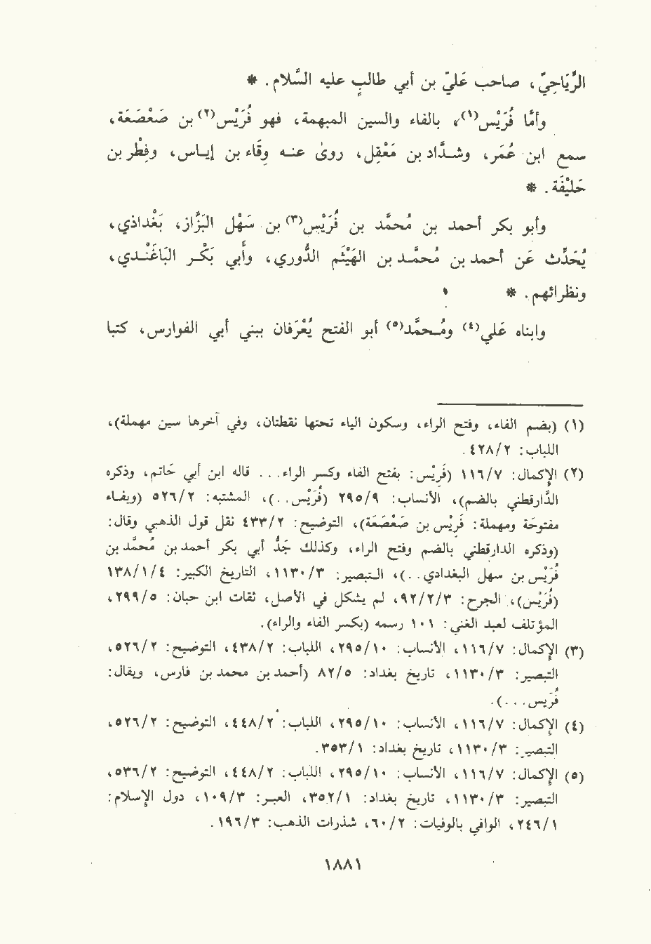 وأمَّا فُرَيْس , بالفاء والسين المبهمة , فهو فُرَيْس بن صَعْصَعة , سَمِعَ ابن عُمَر , وشداد بن مَعْقِل , رَوَى عَنْه وقاء بن إياس , وفطر بن خليفة.