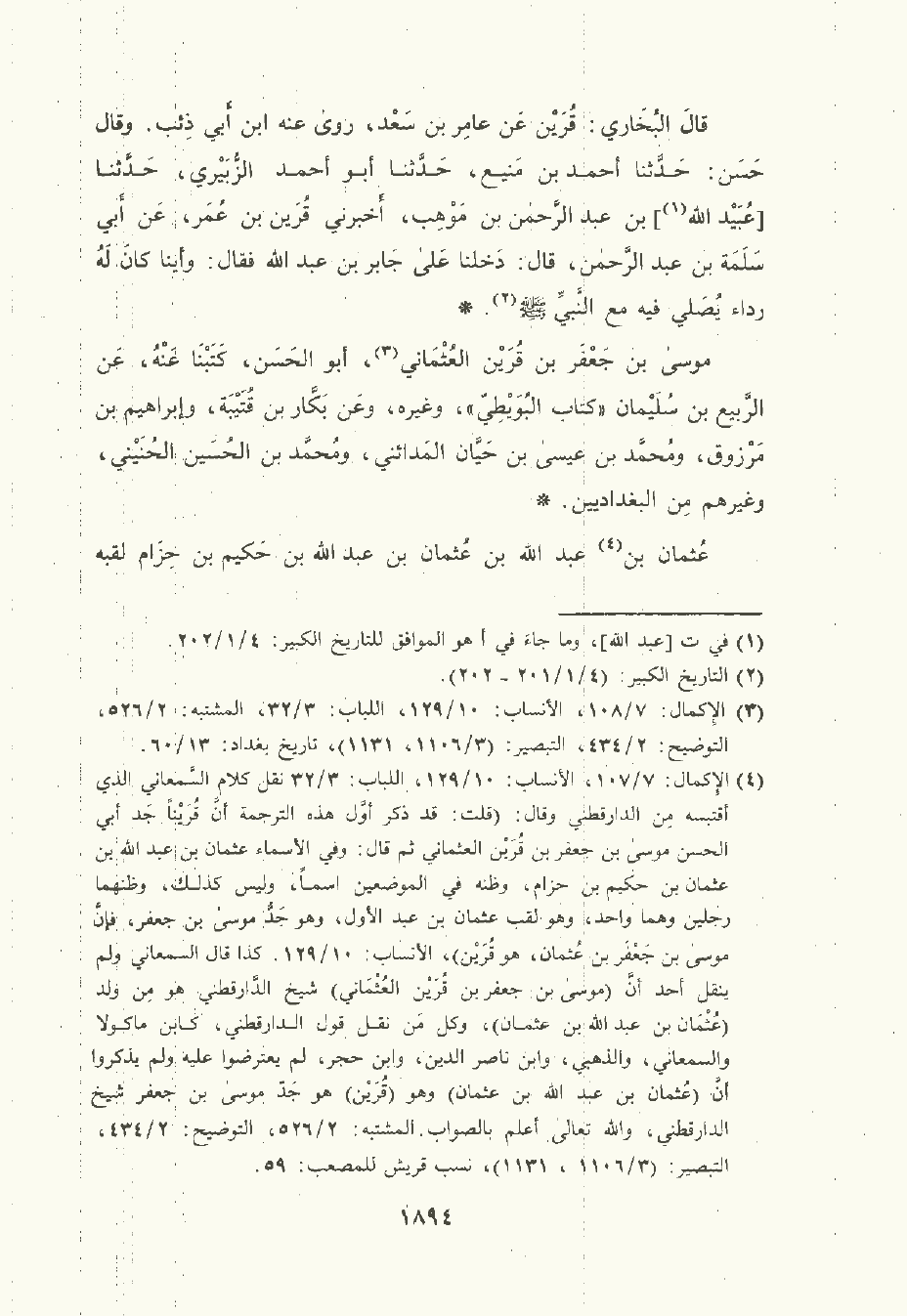 عُثْمان بن عَبد الله بن عُثْمان بن عَبد الله بن حكيم بن حزام لقبه قُرَيْن , وبه يُعْرَف , وأمه سكينة بنت الحُسَين بن علي.