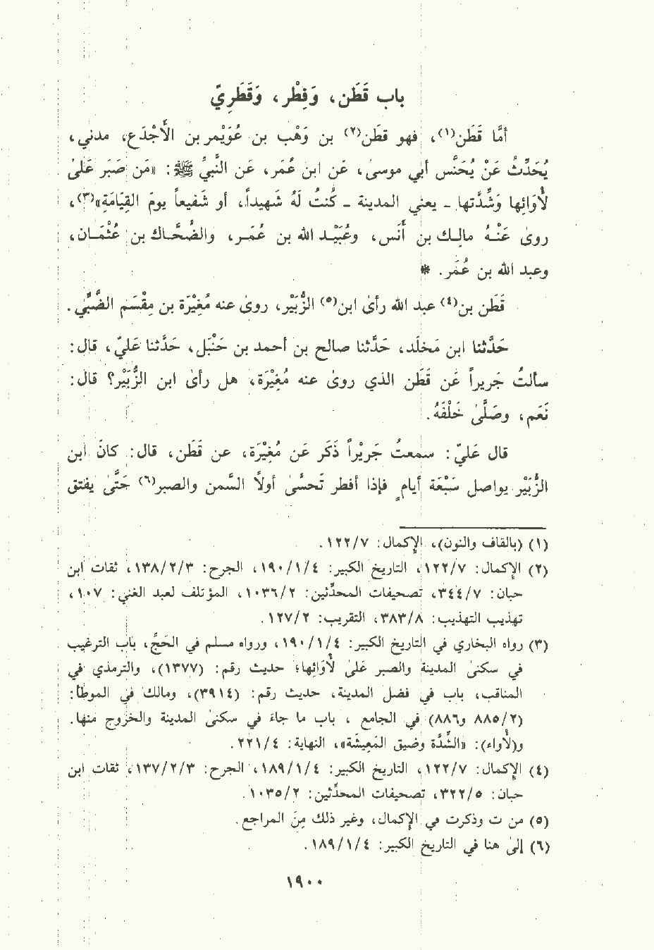 حَدَّثَنا ابن مَخْلَد , حَدَّثَنا صَالِح بن أحمد بن حَنْبل , حَدَّثَنا علي , قال: سَأَلتُ جريرا عن قَطَن الذي رَوَى عَنْه مُغِيرَة هل رأى ابن الزُّبَيْر؟ قال: نعم وصلى خلفه.